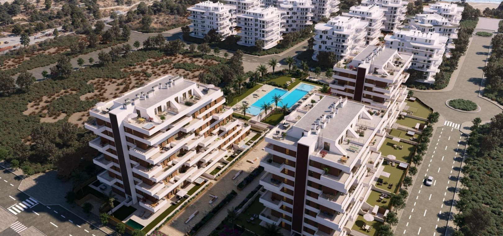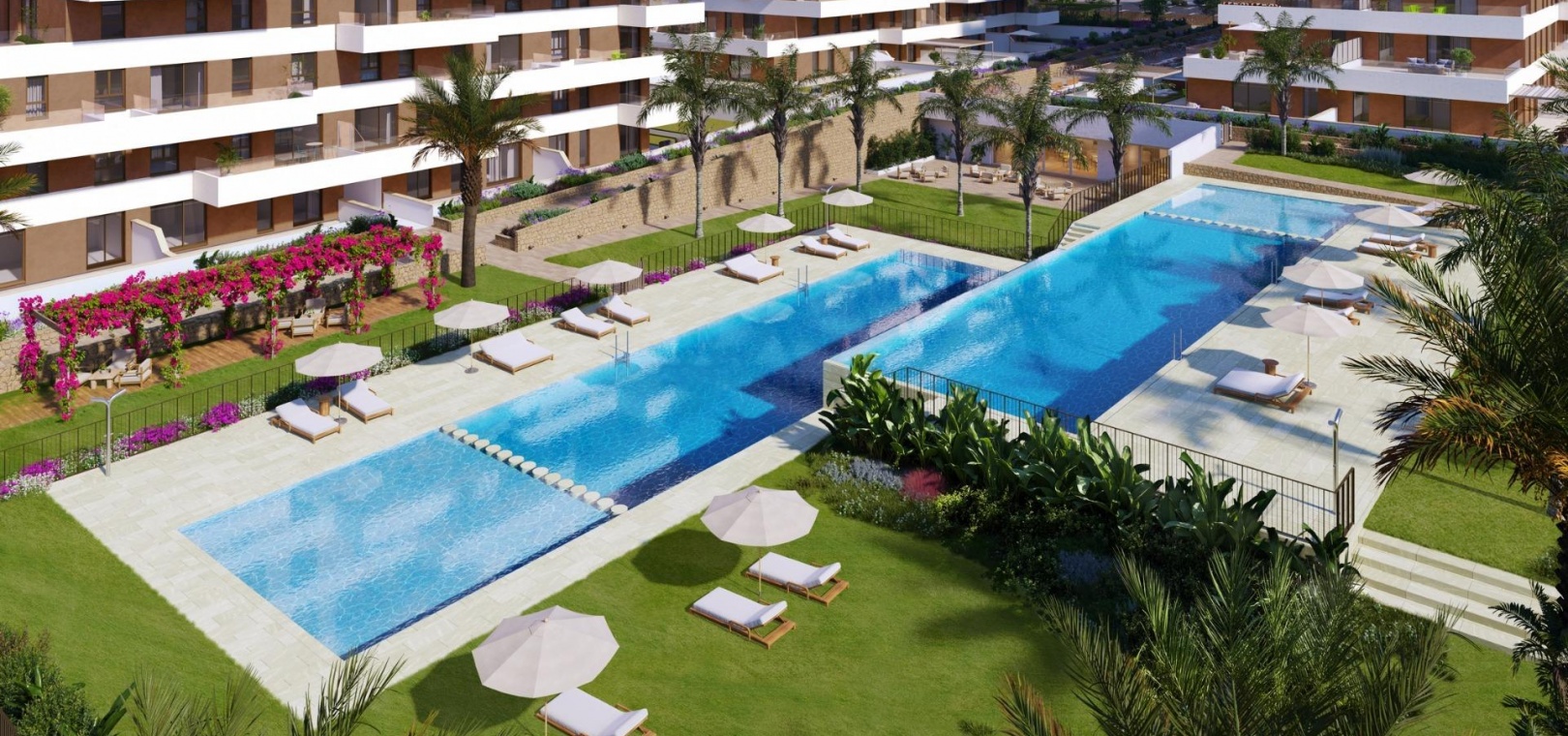 Modern Apartments with 2 and 3 bedrooms, open plan kitchen with living area, large terraces and a complete urbanisation that includes a social club, gym and swimming pool.