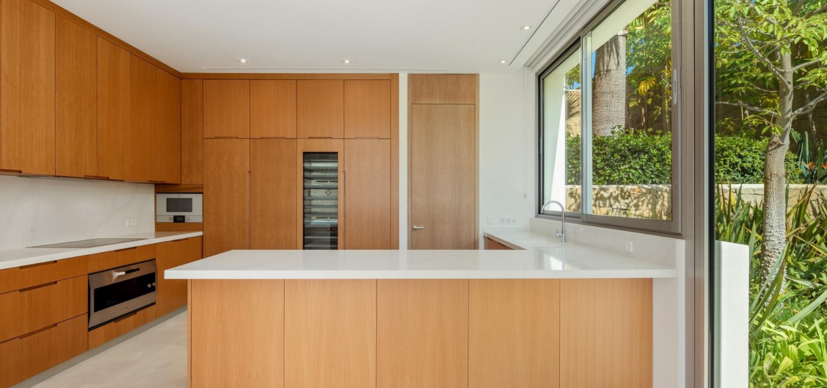 The length pool, decorated with stunning aquamarine tiles invites all to take a dip, while the luscious palm trees provide shade and an aesthetic backdrop for relaxation. The interiors exude refinement, with every detail meticulously curated using the finest materials, ensuring an unparalleled sense of luxury. The stunning kitchen, equipped with state-of-the-art Gaggenau appliances, is a culinary haven that seamlessly combines practicality with aesthetics.