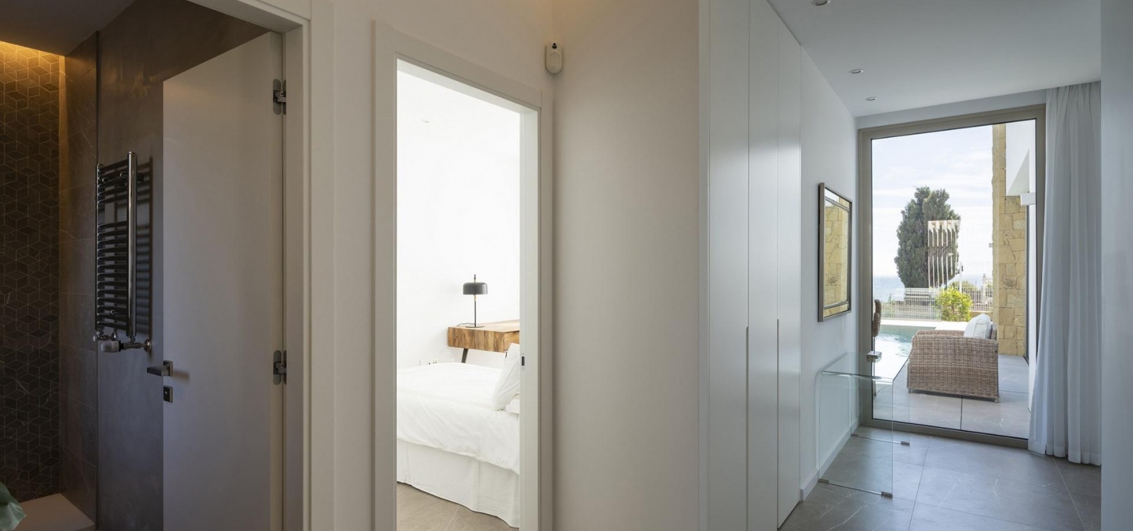 Upper floor: additional bedrooms, including the master suite with freestanding bathtub and access to private terraces, some with sea views.