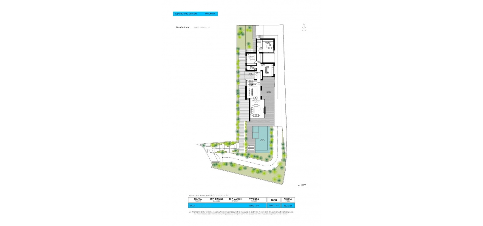 Main floor: large living and dining area with kitchen, laundry room, guest toilet, and one bedroom with ensuite bathroom. The living space opens onto an expansive terrace with a private pool and garden.
