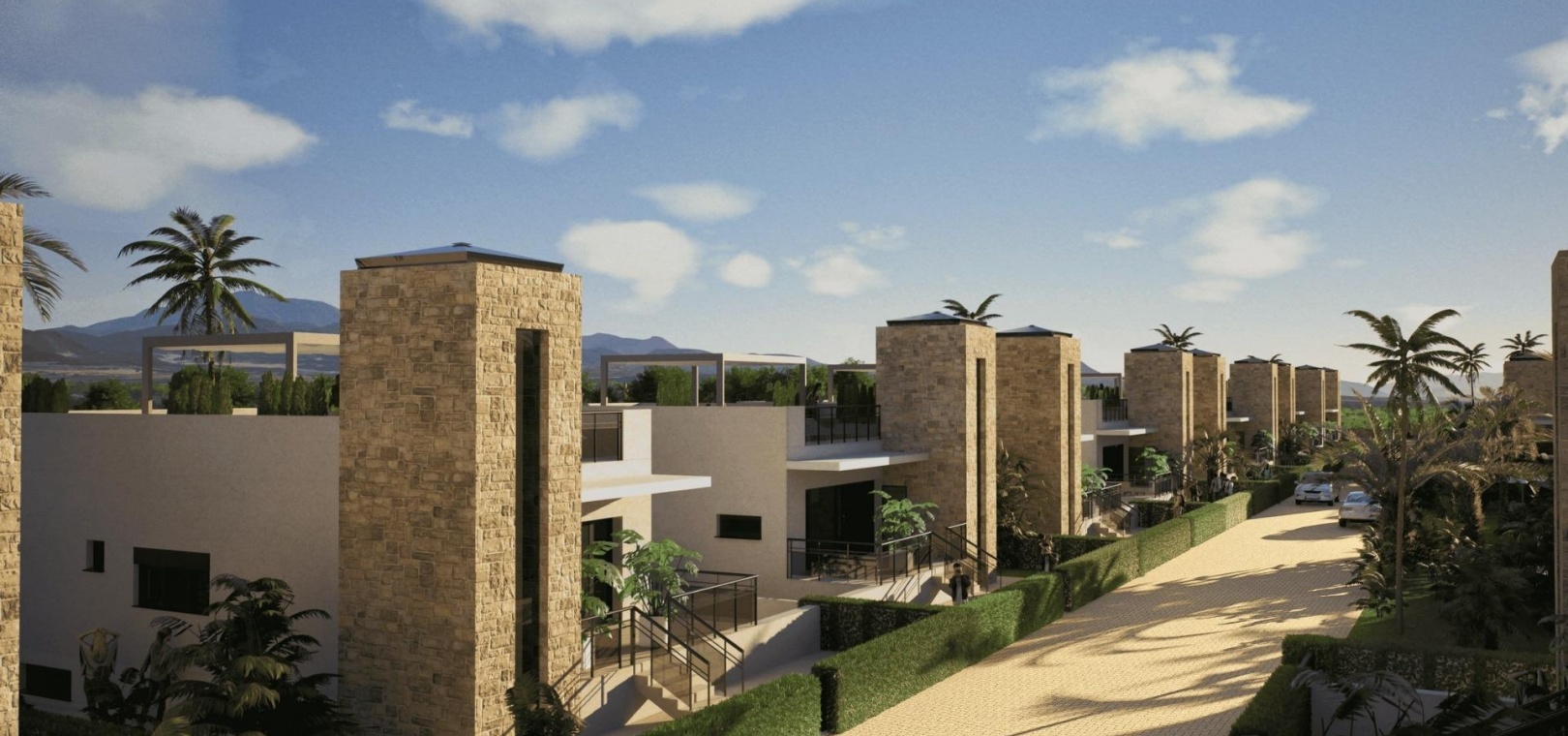 Discover this private residential complex of 69 independent villas located in a plot frontline to Camposol Golf in Mazarron, Murcia. Designed around a large central green oasis with a communal swimming pool and landscaped gardens, this development offers a peaceful and secure environment ideal for enjoying the Mediterranean lifestyle.