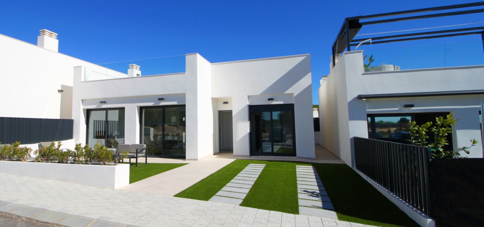 Denna lyxiga moderna enplansvilla ligger på golfanläggningen Lo Romero, bara några minuters bilresa från den spanska staden Pilar de la Horadada. Denna fastighet är byggd till högsta standard och är färdig och redo att flytta in.
