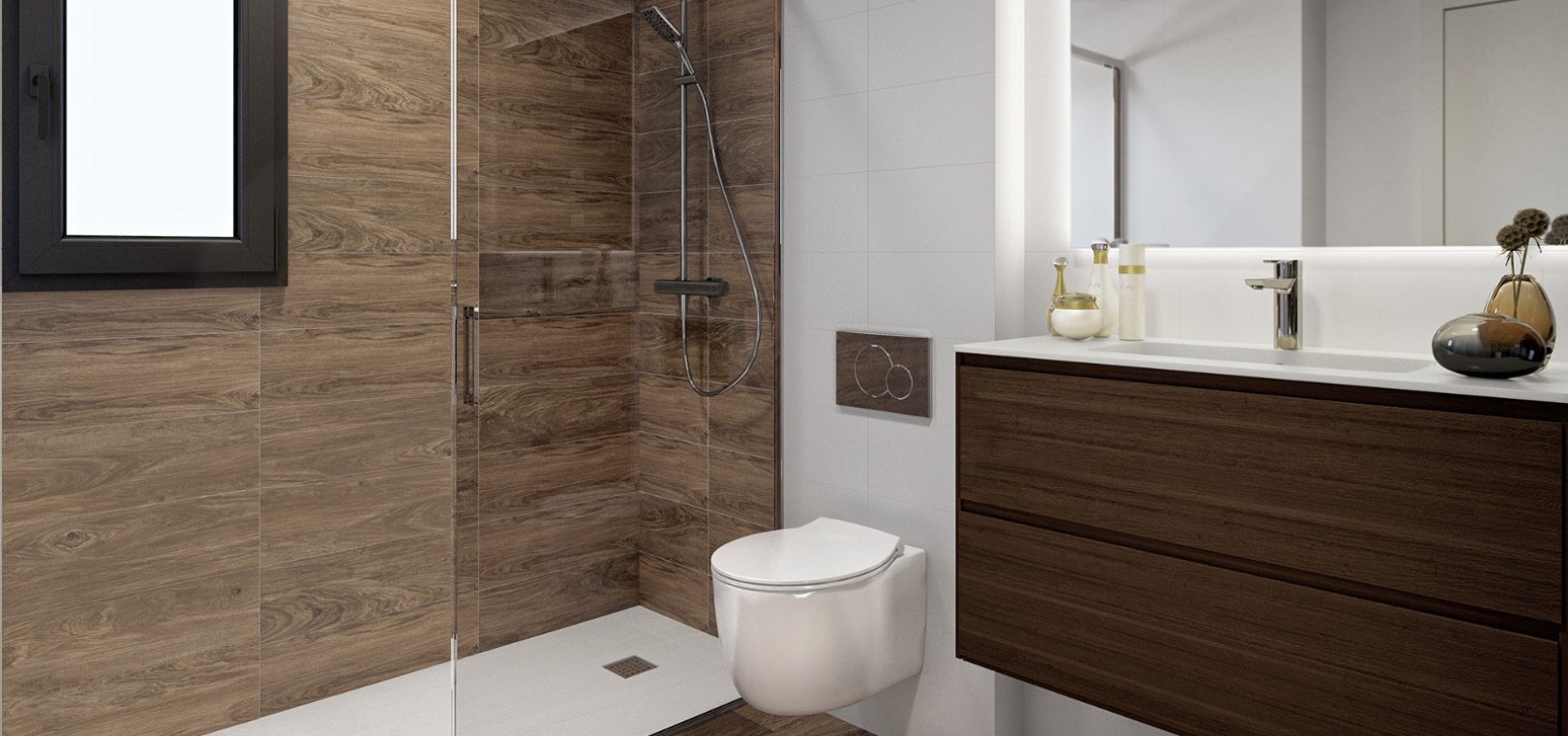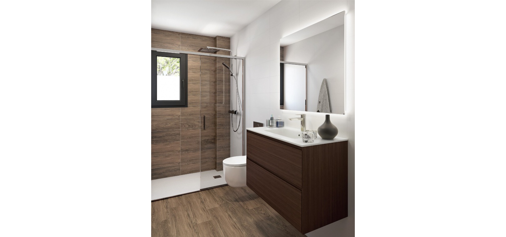 På första våningen finns ett master bedroom med inbyggda garderober, eget badrum och en privat solterrass, ytterligare ett dubbelrum med inbyggda garderober och badrum och det finns en stor delad övre solterrass på denna nivå som kan nås från sovrum 3.