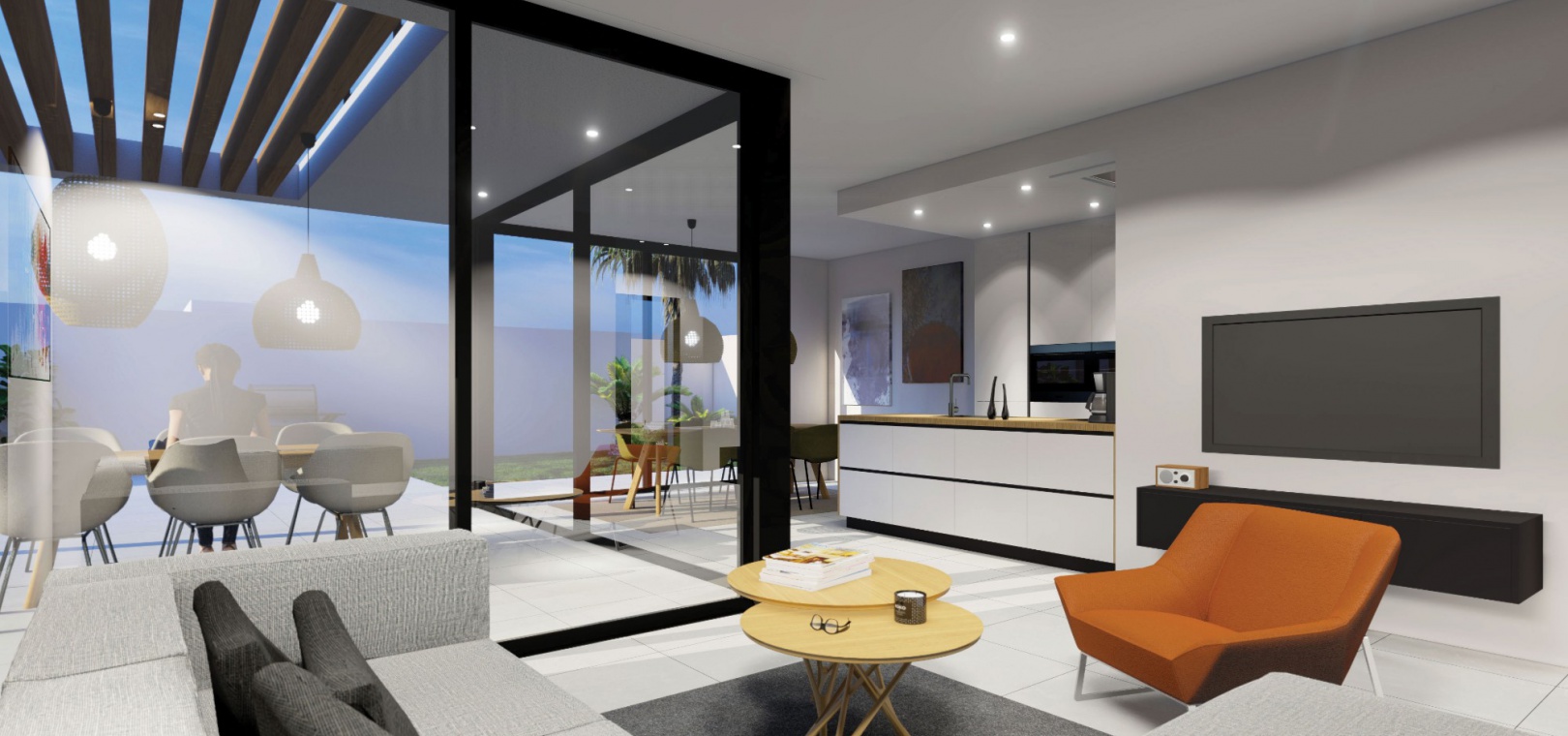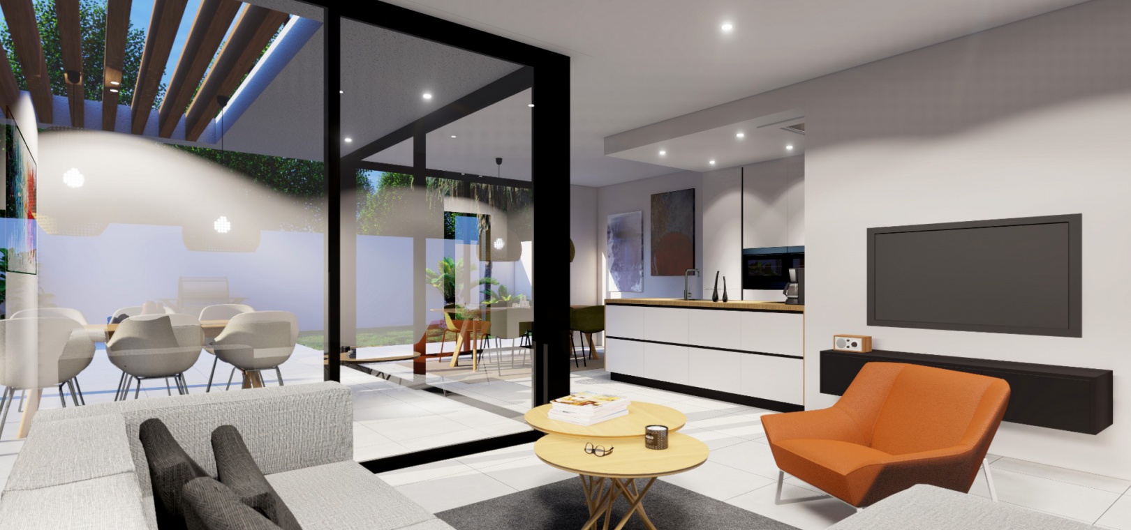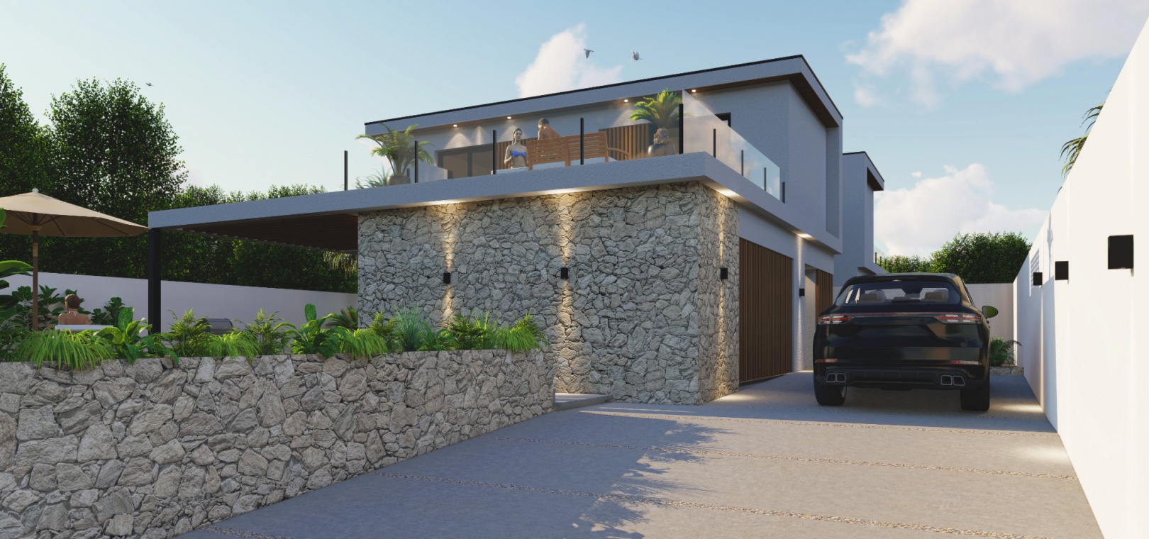 Fastigheten är byggd med material av högsta kvalitet och består av en vardagsrumsdel med öppen planlösning med altandörrar som leder ut i trädgården med möjlighet att lägga till en privat pool, ett modernt utrustat kök med angränsande tvättstuga, ett master bedroom med walk-in garderob och badrum och det finns även ett gästtoalett på denna nivå.