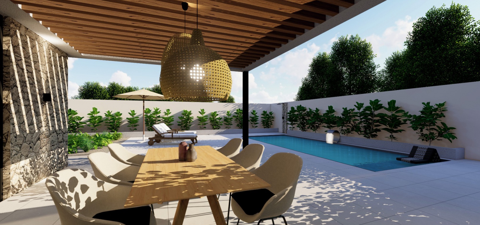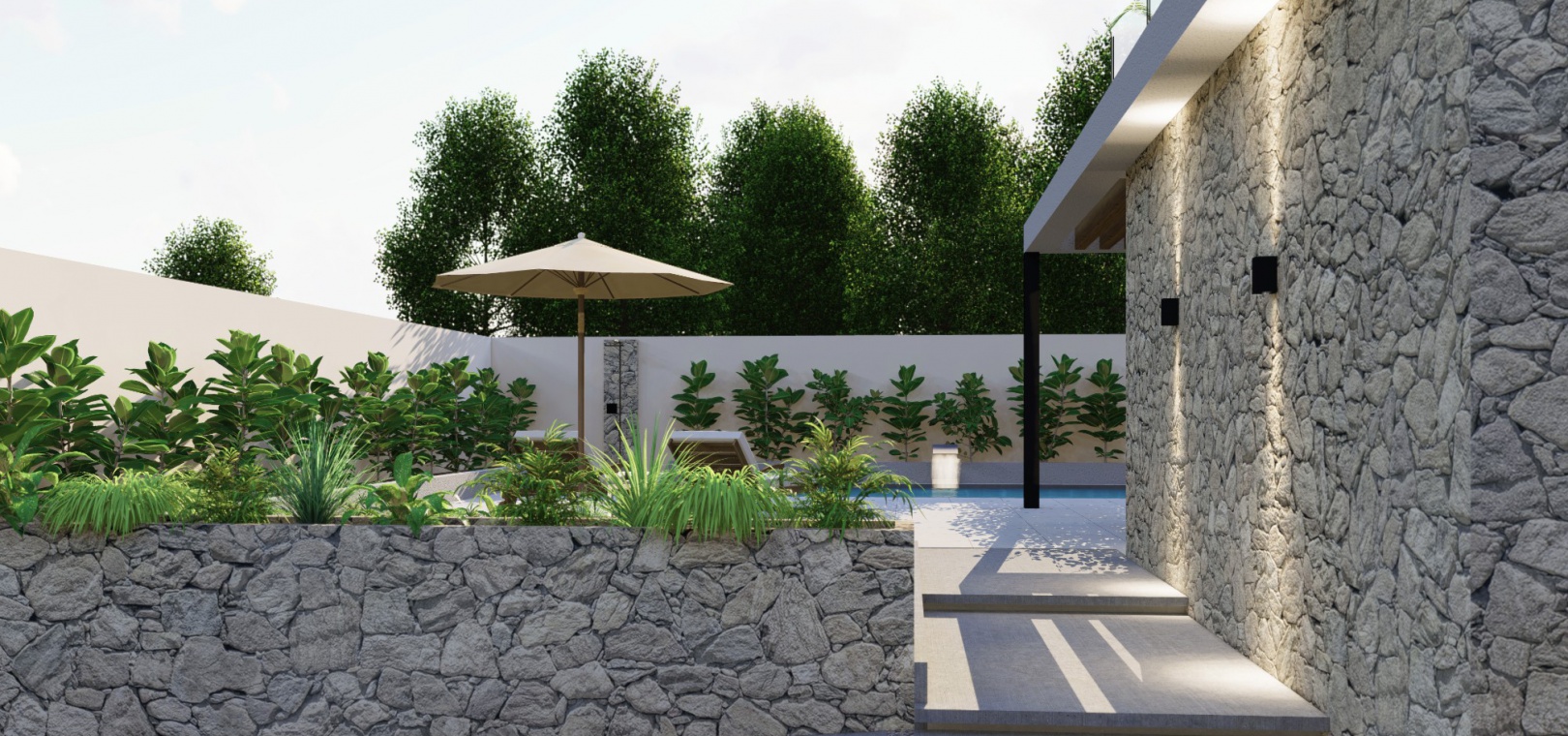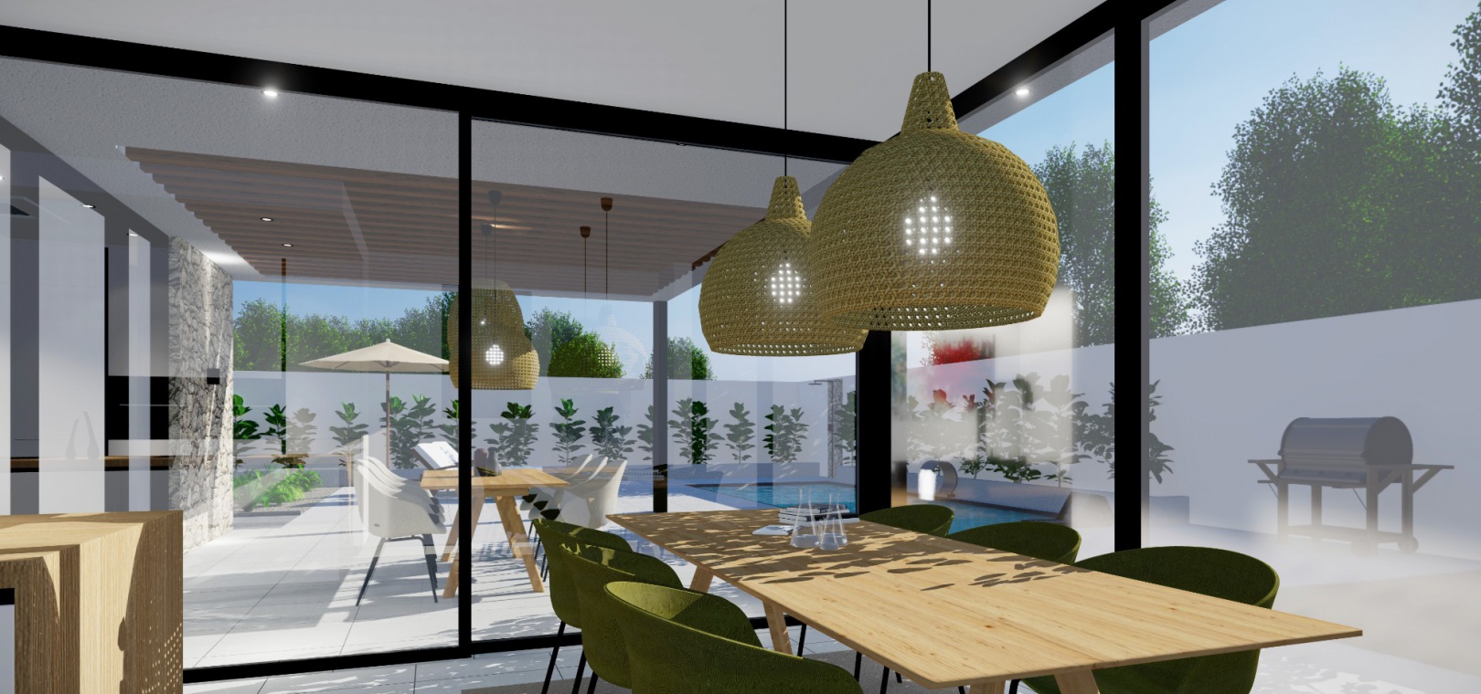 Fastigheten är byggd med material av högsta kvalitet och består av en vardagsrumsdel med öppen planlösning med altandörrar som leder ut i trädgården med möjlighet att lägga till en privat pool, ett modernt utrustat kök med angränsande tvättstuga, ett master bedroom med walk-in garderob och badrum och det finns även ett gästtoalett på denna nivå.