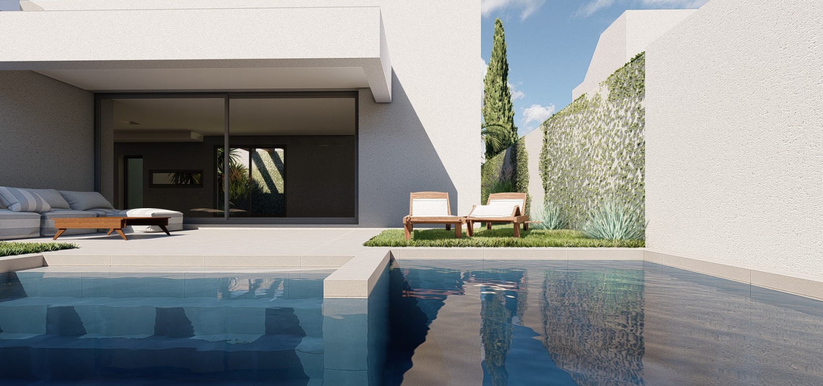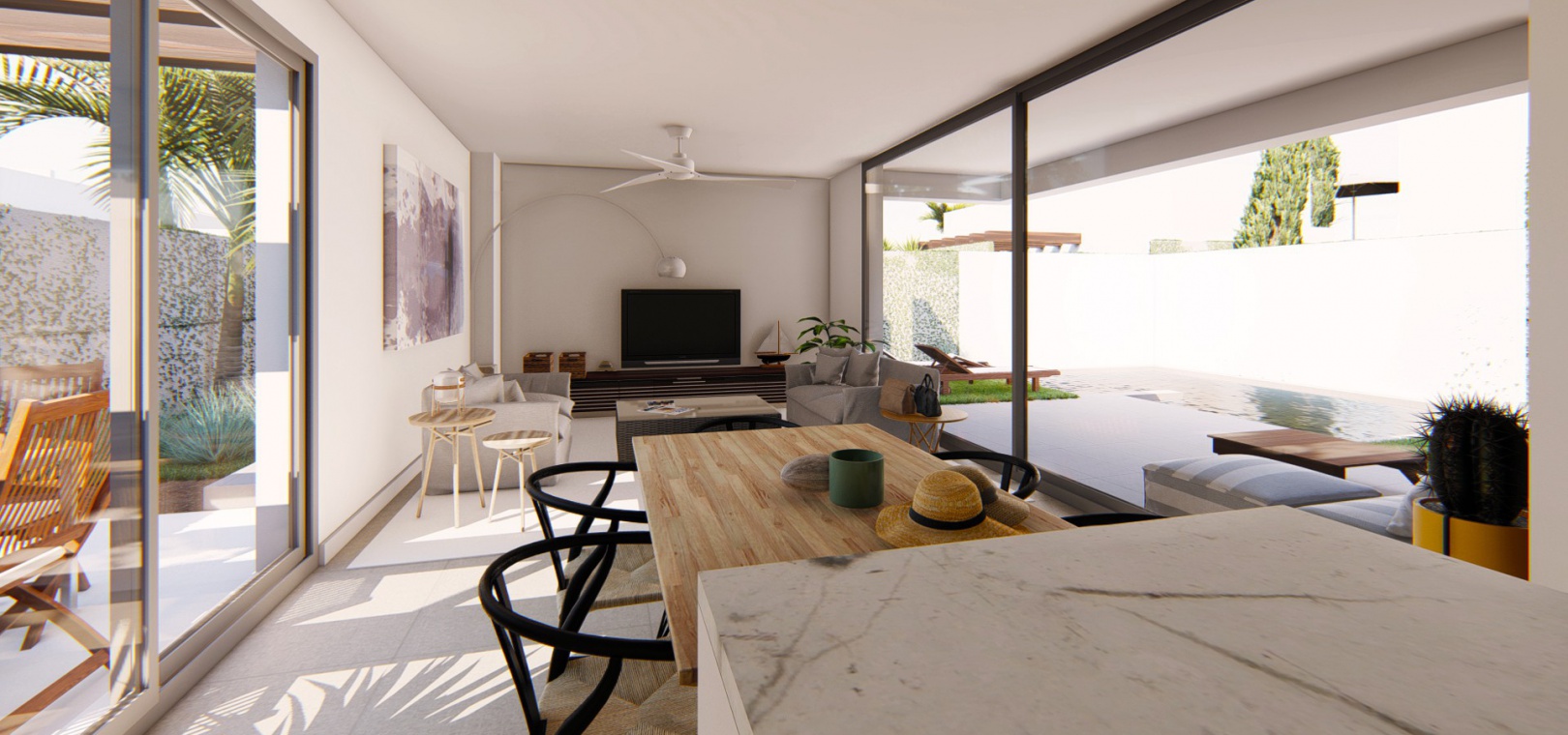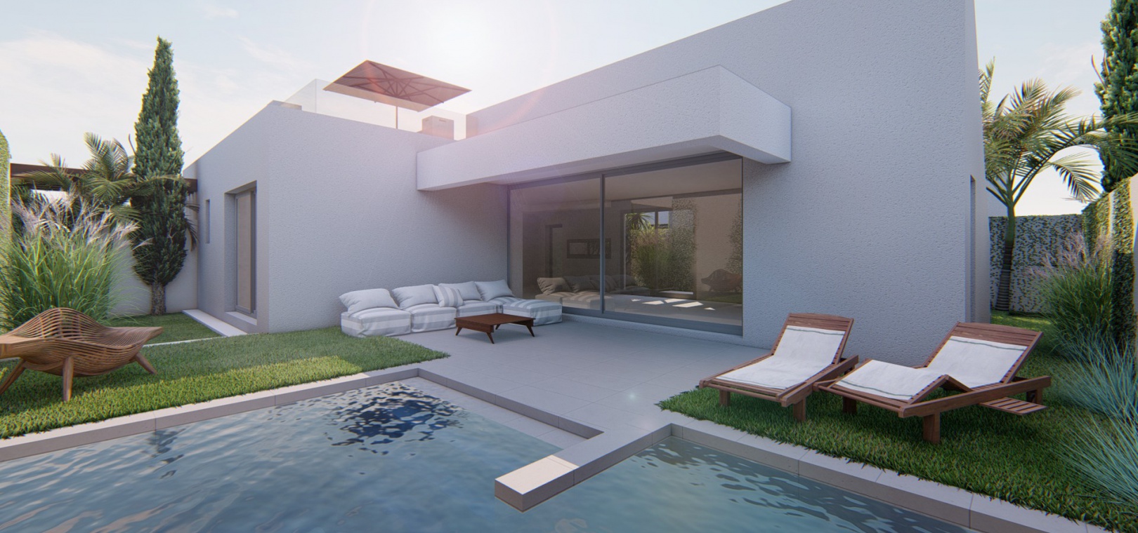 Denna lyxiga moderna villa ligger bara 400 meter från stranden i Mar de Cristal nära den livliga staden Los Belones i La Manga på Mar Menor. Denna fastighet är byggd enligt högsta standard och har privat pool, modernt kök med inbyggda apparater och ett privat takterrass.