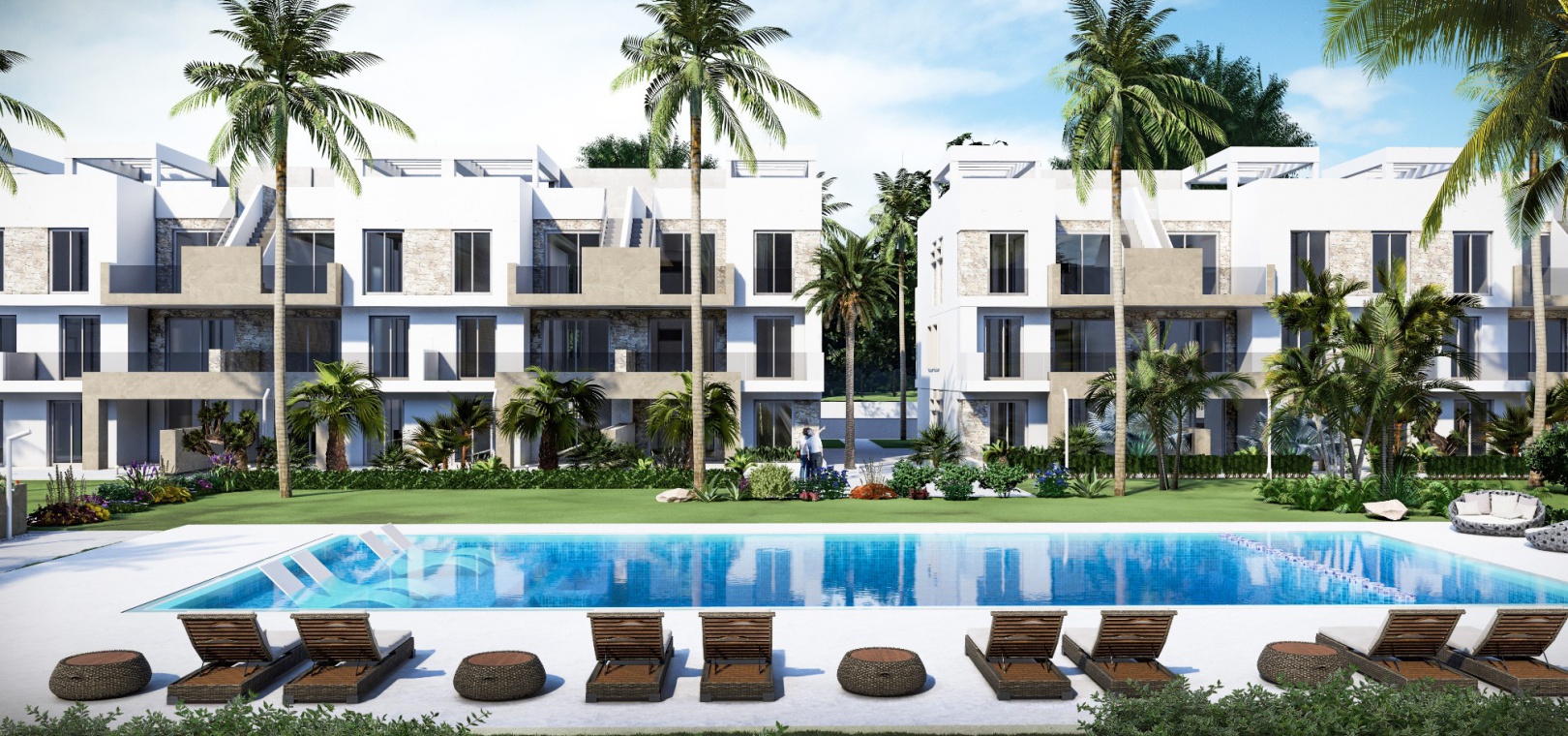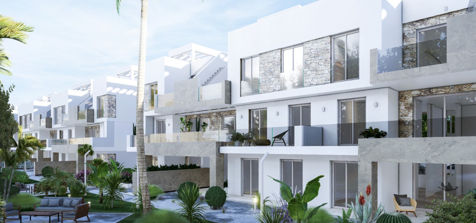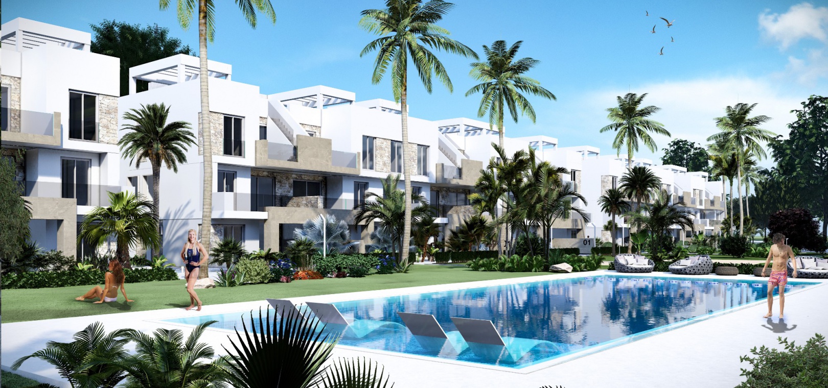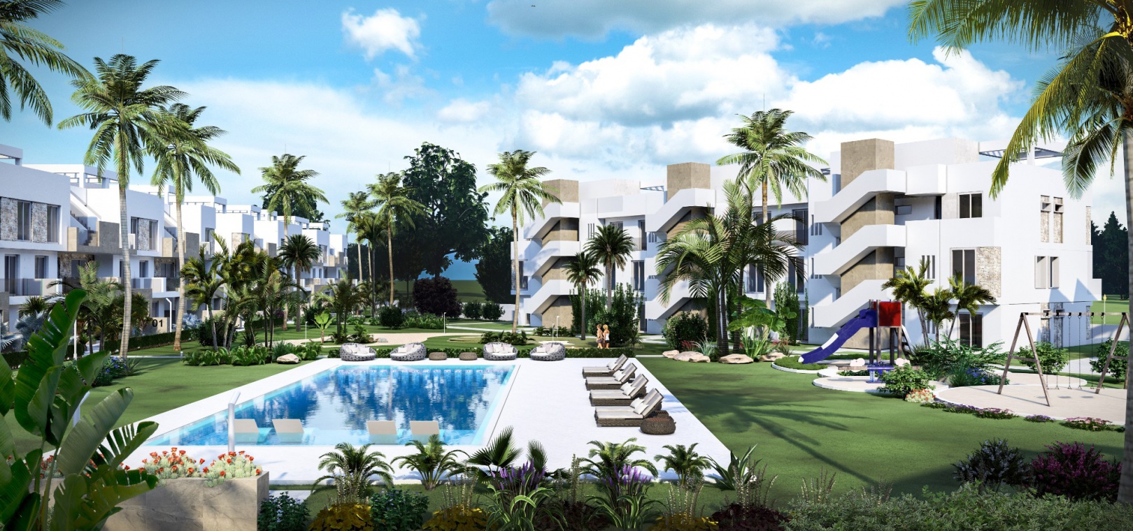 Dessa fantastiska lägenheter finns på bottenvåningen med stor terrass/trädgård, första våningen med terrass eller takvåning med solarium på taket. Anläggningen inkluderar härliga gemensamma trädgårdar med palmer, pool, lekplats, minigolf, petanquebana, pingisbord, gym, spa och säker underjordisk parkering ingår också.