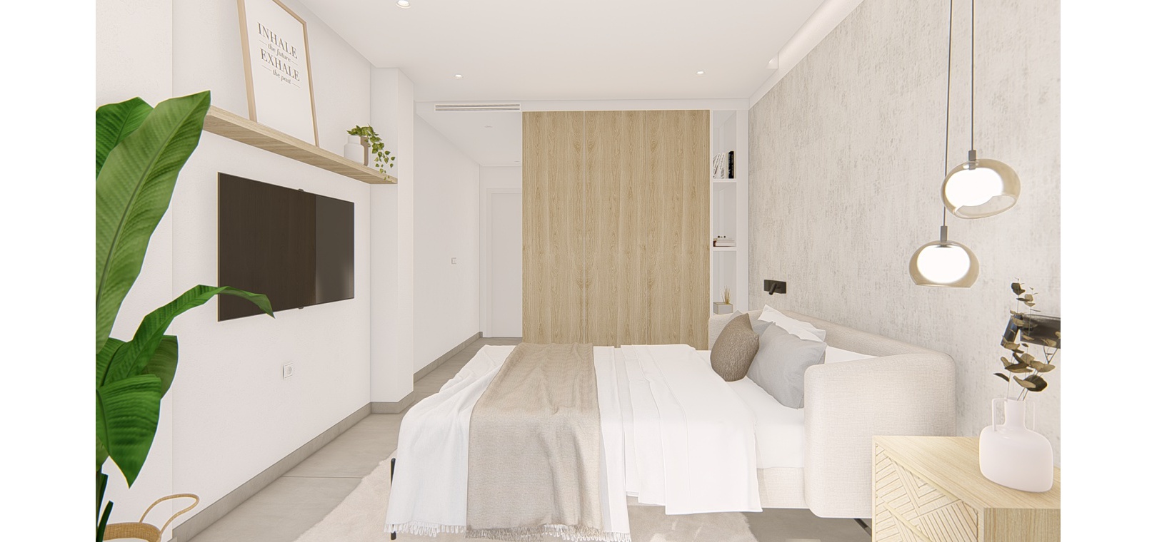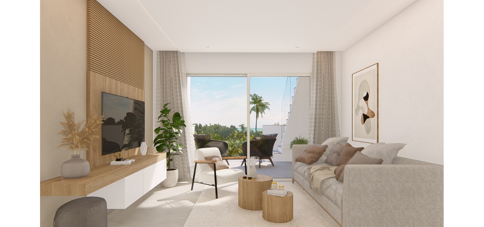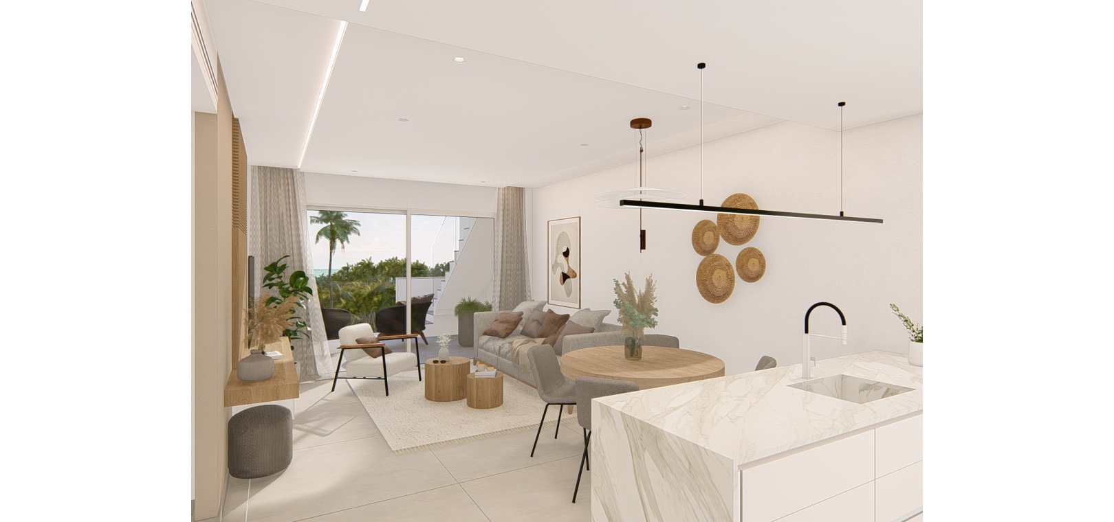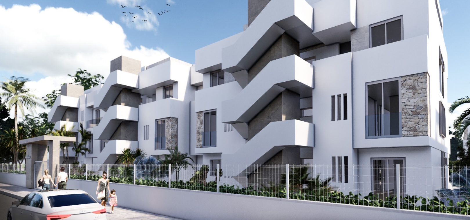 Dessa fantastiska lägenheter finns på bottenvåningen med stor terrass/trädgård, första våningen med terrass eller takvåning med solarium på taket. Anläggningen inkluderar härliga gemensamma trädgårdar med palmer, pool, lekplats, minigolf, petanquebana, pingisbord, gym, spa och säker underjordisk parkering ingår också.