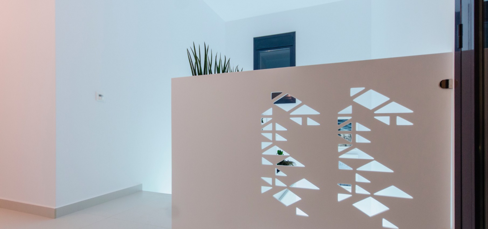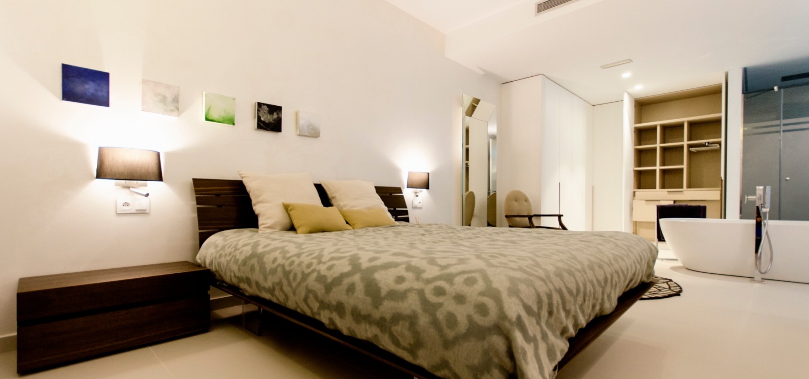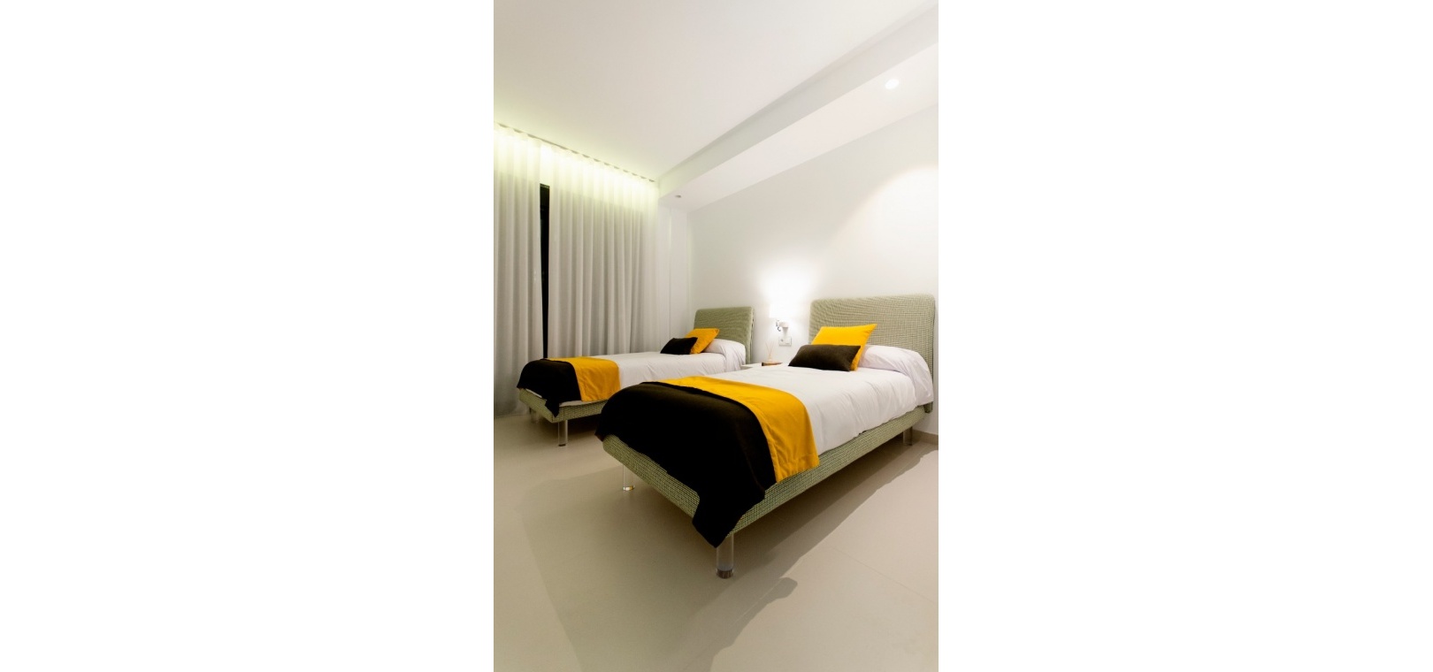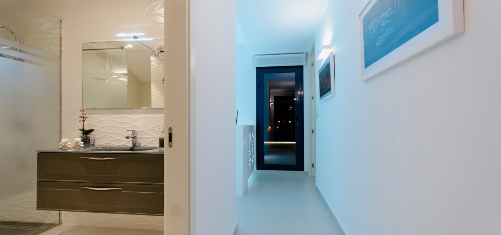 På första våningen finns ett sovrum med inbyggda garderober, eget badrum och privat terrass, ytterligare ett sovrum med inbyggda garderober och badrum och en intern trappa som leder upp till ett privat taksolarium där du kan njuta av magnifik havsutsikt och hela dagen sol.