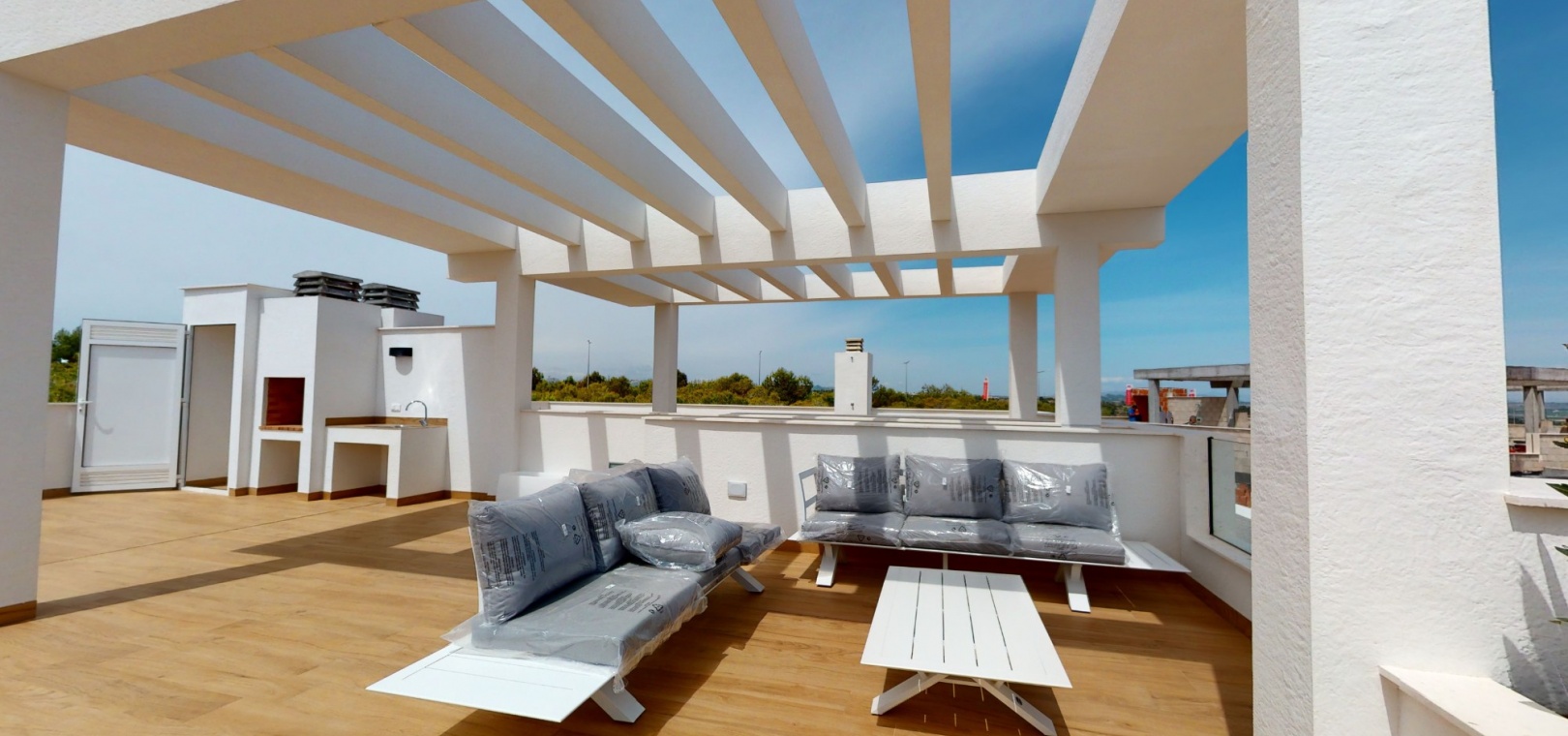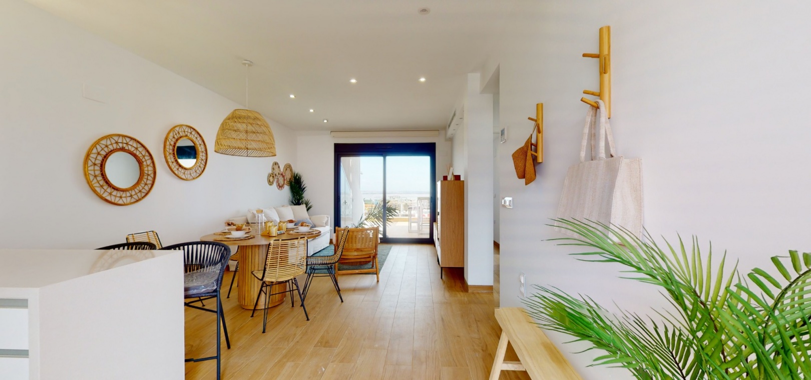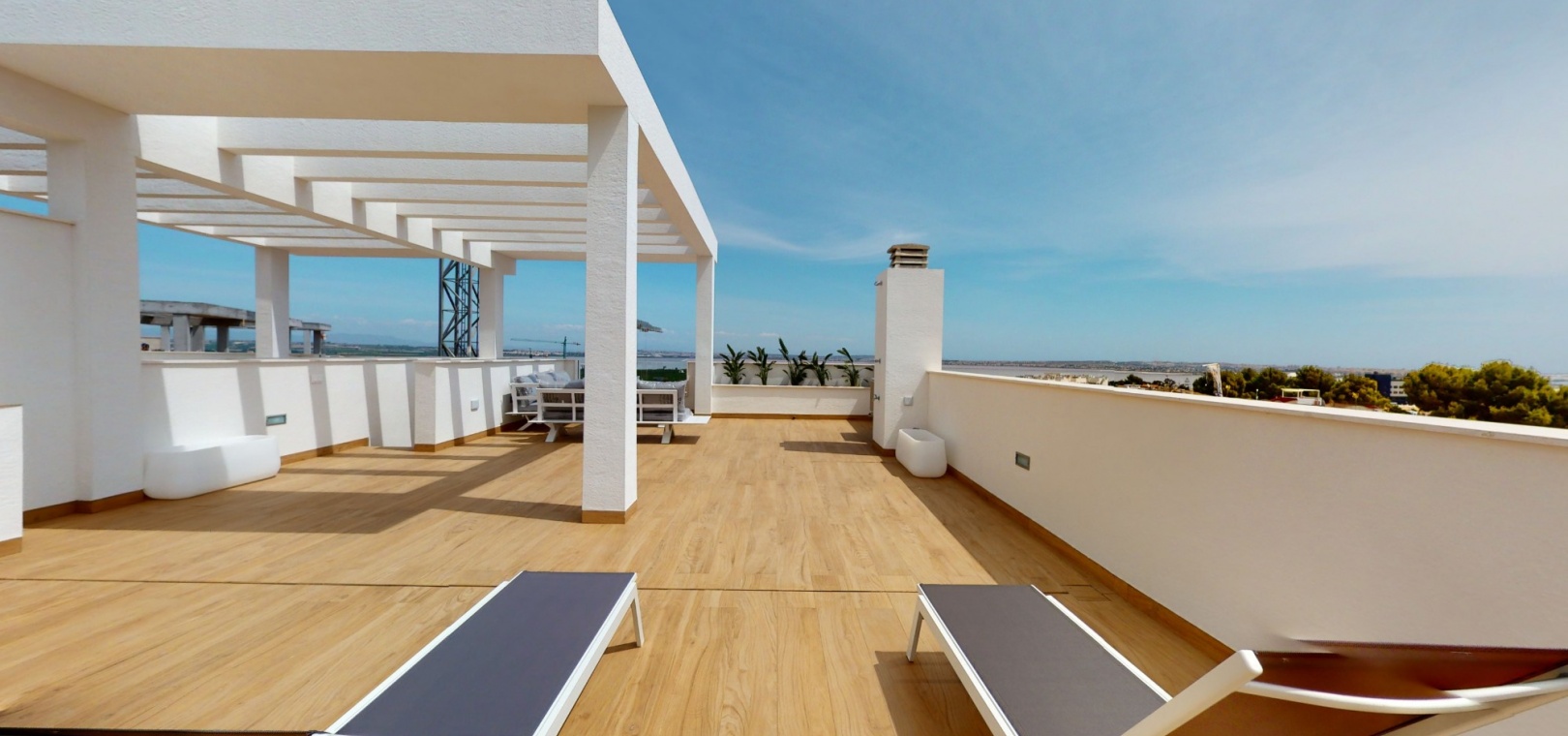 Denna takvåning består av en vardagsrumsdel med öppen planlösning med altandörrar som leder ut på terrassen med utsikt över den gemensamma poolen, ett modernt utrustat kök med inbyggda apparater inklusive ugn, spis, fläkt, kyl/frys, tvättmaskin, diskmaskin och mikrovågsugn, en master bedroom med inbyggda garderober och badrum, ett annat dubbelrum också med inbyggda garderober och ett gästtoalett. En trappa leder upp till ett privat solarium på taket som har sol hela dagen och utsikt över saltsjön.