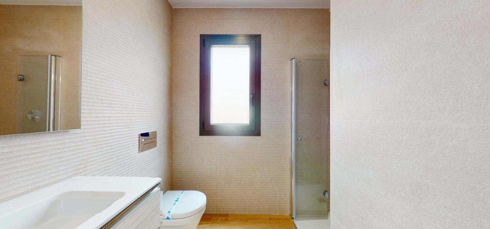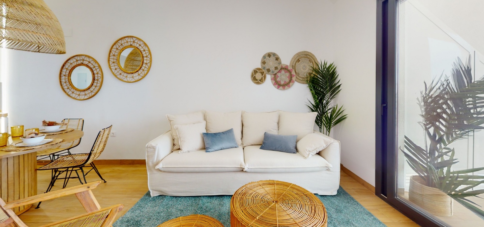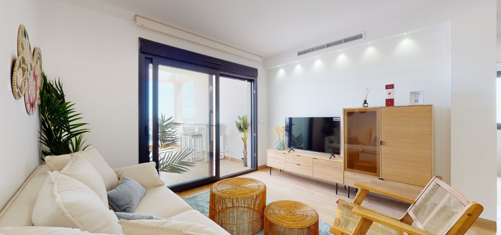 Denna takvåning består av en vardagsrumsdel med öppen planlösning med altandörrar som leder ut på terrassen med utsikt över den gemensamma poolen, ett modernt utrustat kök med inbyggda apparater inklusive ugn, spis, fläkt, kyl/frys, tvättmaskin, diskmaskin och mikrovågsugn, en master bedroom med inbyggda garderober och badrum, ett annat dubbelrum också med inbyggda garderober och ett gästtoalett. En trappa leder upp till ett privat solarium på taket som har sol hela dagen och utsikt över saltsjön.