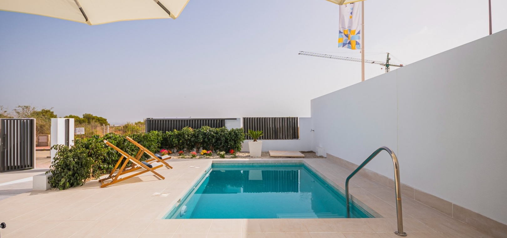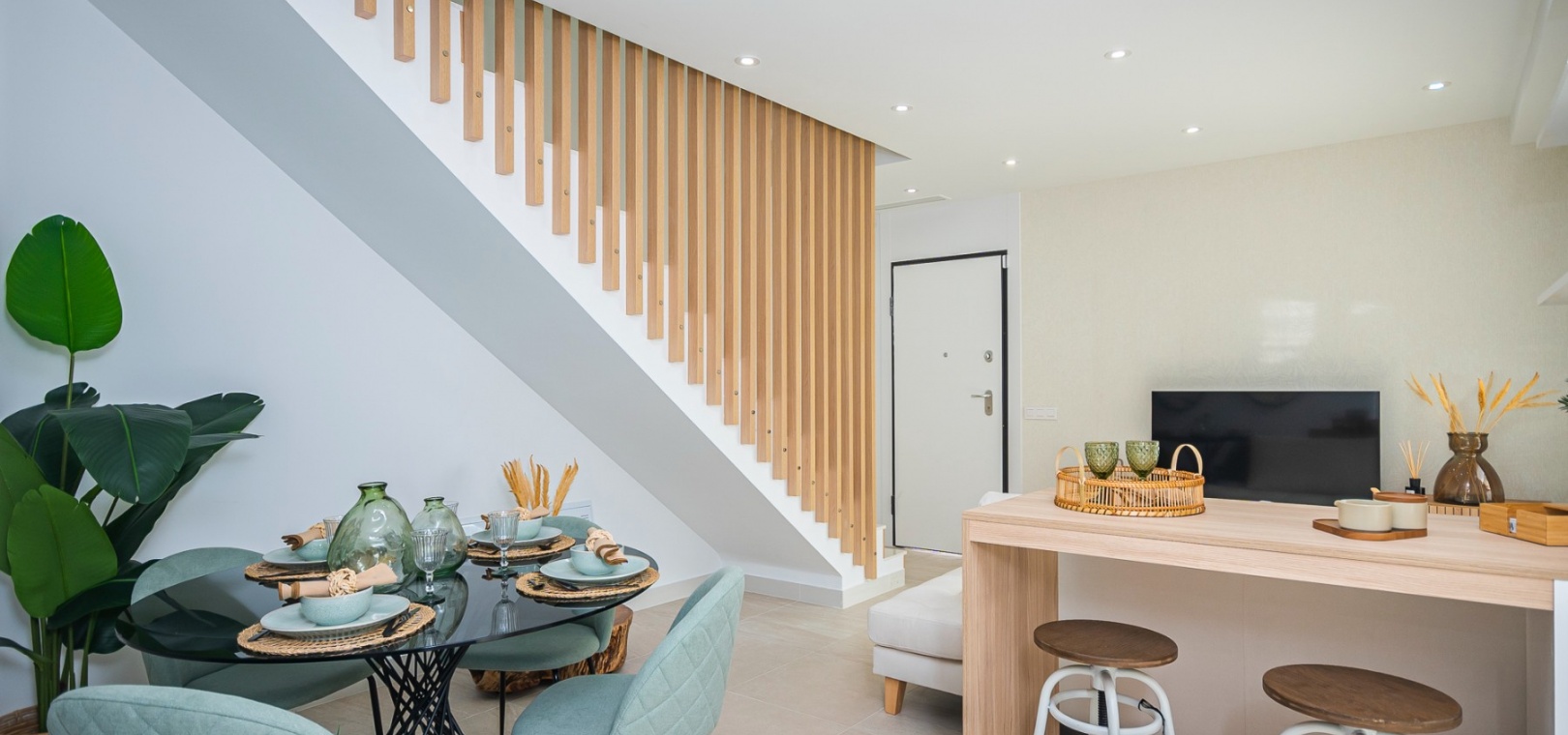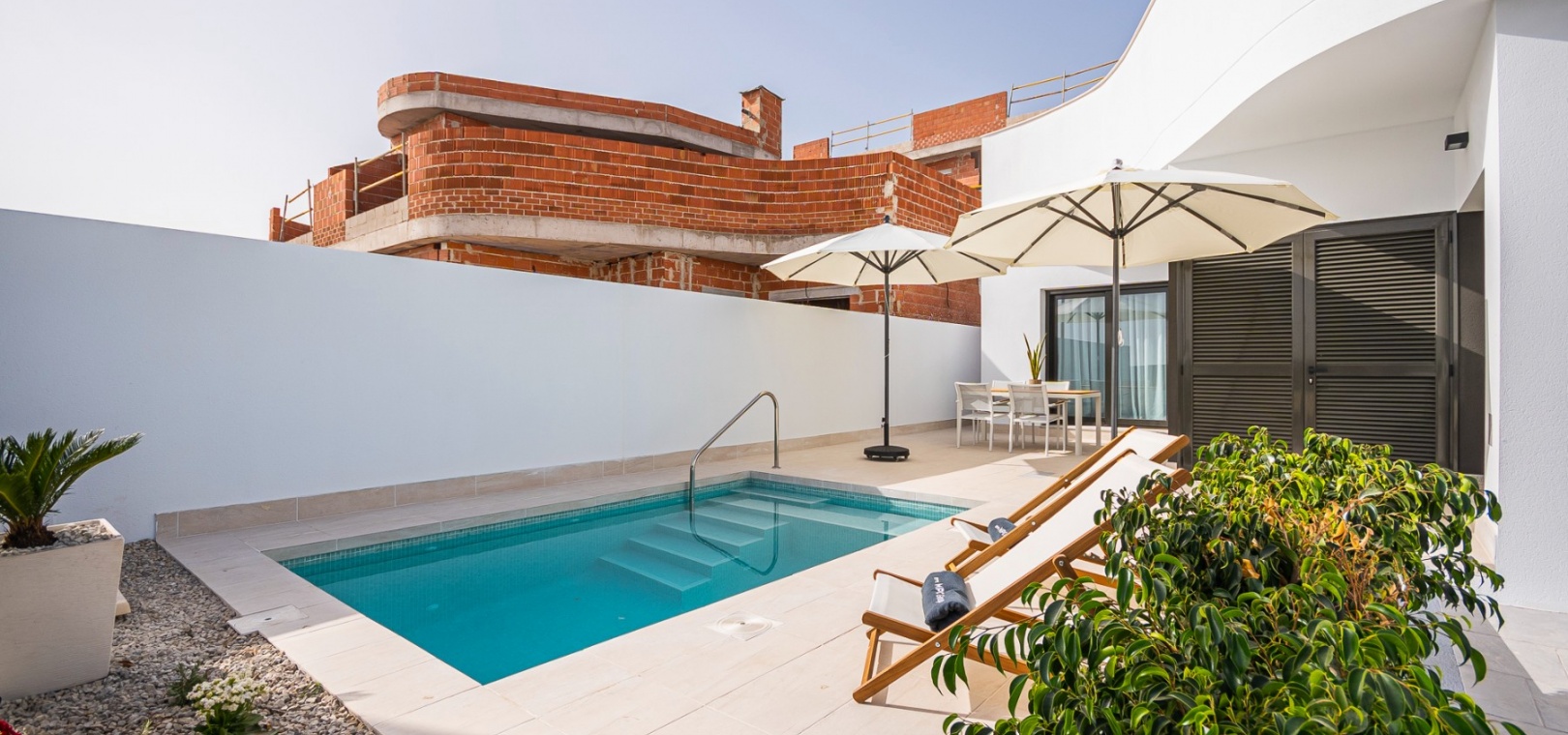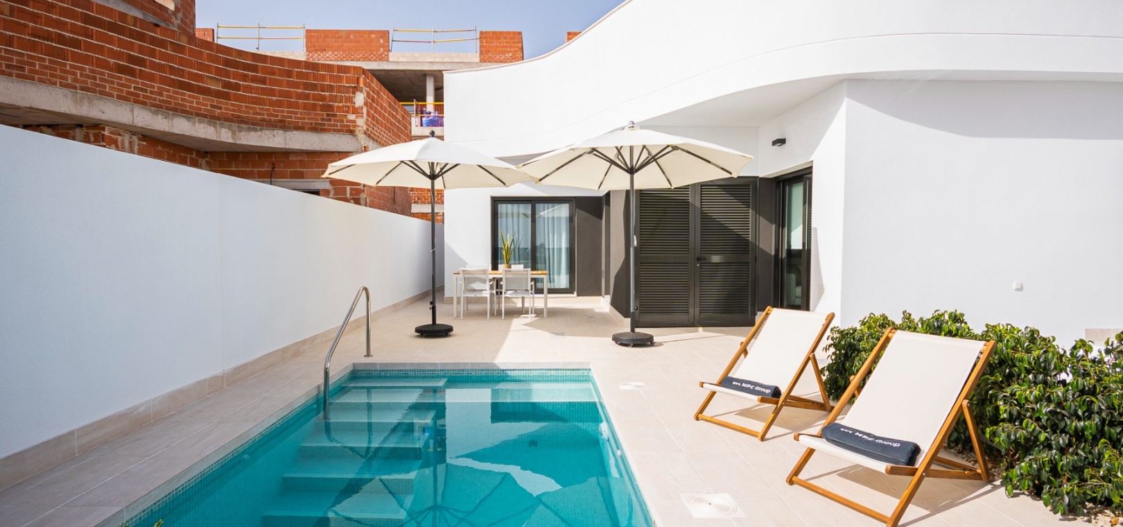 Det finns härliga gemensamma trädgårdar med 2 pooler och varje fastighet inkluderar LED-belysning, förinstallation av varm/kall ventilerad luftkonditionering, utrustat kök med vitvaror och ett säkert underjordiskt utrymme med förvaring.