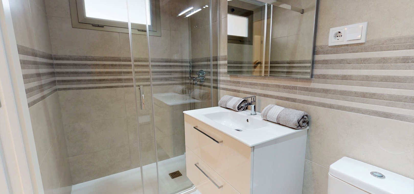 Denna lägenhet inkluderar alla köksmaskiner, varm/kall luftkonditionering, LED-belysning, kompletta badrum med duschskärmar och golvvärme och en säker underjordisk parkeringsplats med förråd.