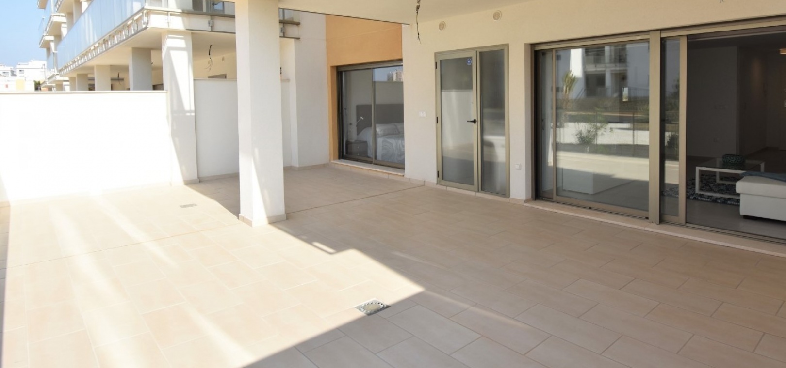 Denna lägenhet på bottenvåningen består av ett stort vardagsrum med altandörrar som leder ut till den stora solterrassen/trädgården, matplats, fullt utrustat modernt kök med vitvaror inklusive ugn, spis, fläkt, kyl/frys, tvättmaskin, diskmaskin och mikrovågsugn, ett master bedroom med inbyggda garderober och badrum, ytterligare ett sovrum med inbyggda garderober och ett gästtoalett.