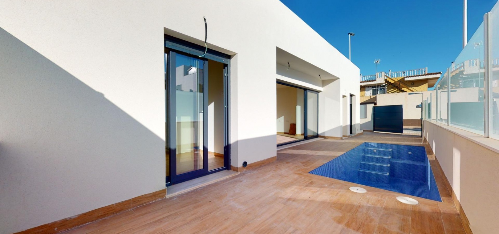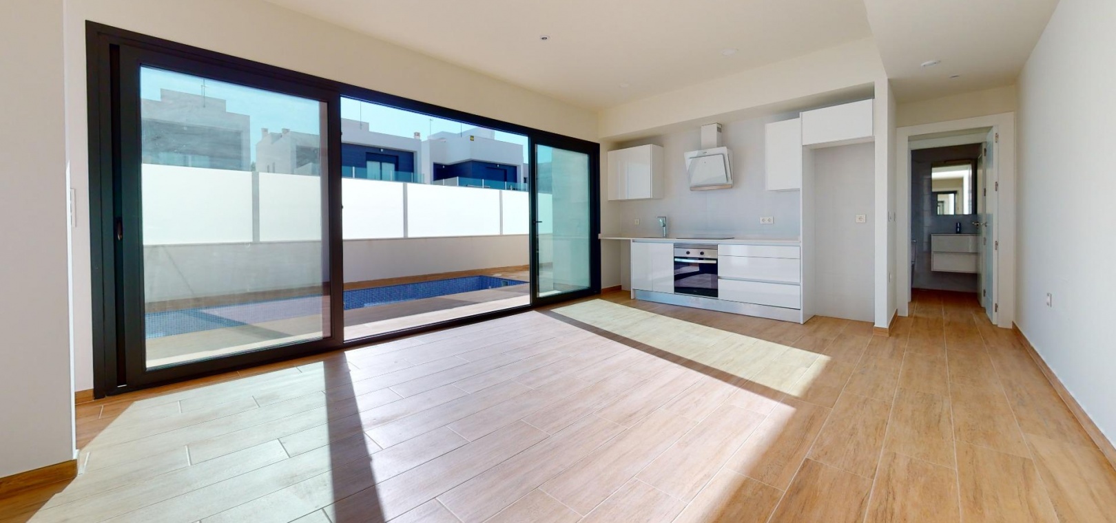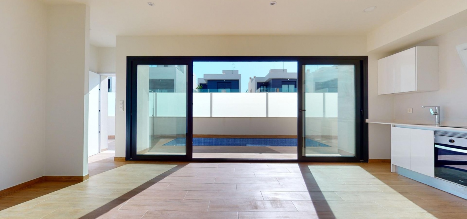 Nybyggd original quad erbjuder dig ett ljust vardagsrum/matsal med en spektakulär skjutdörr framför din privata pool, vilket ger vacker utsikt under dagen och avkopplande utsikt på natten.