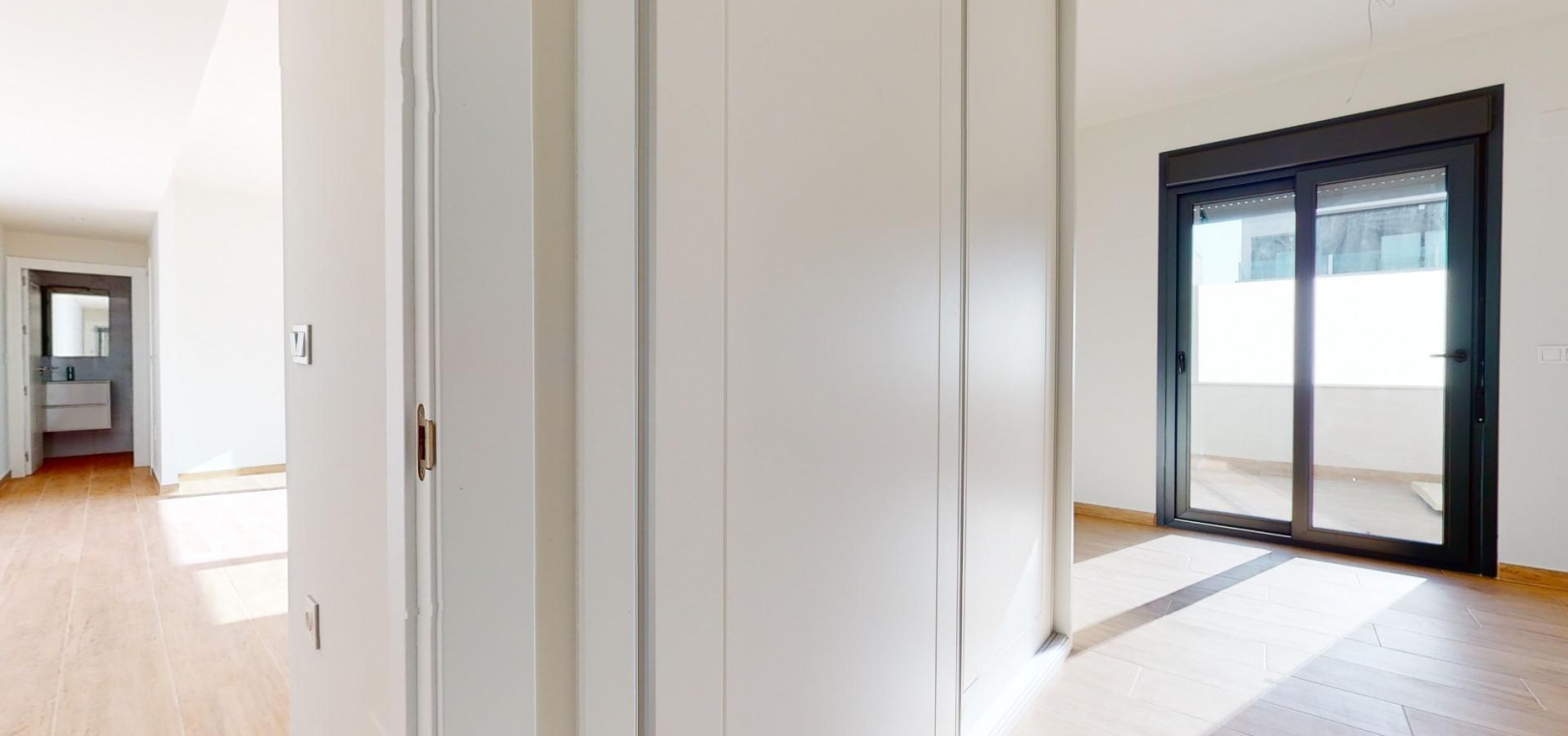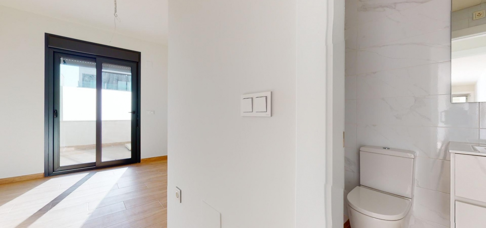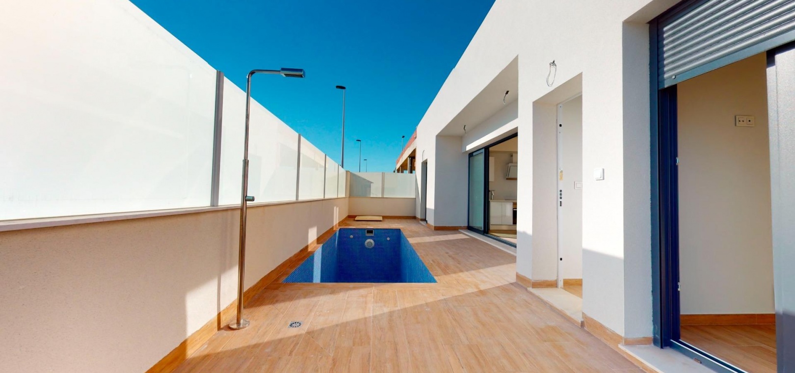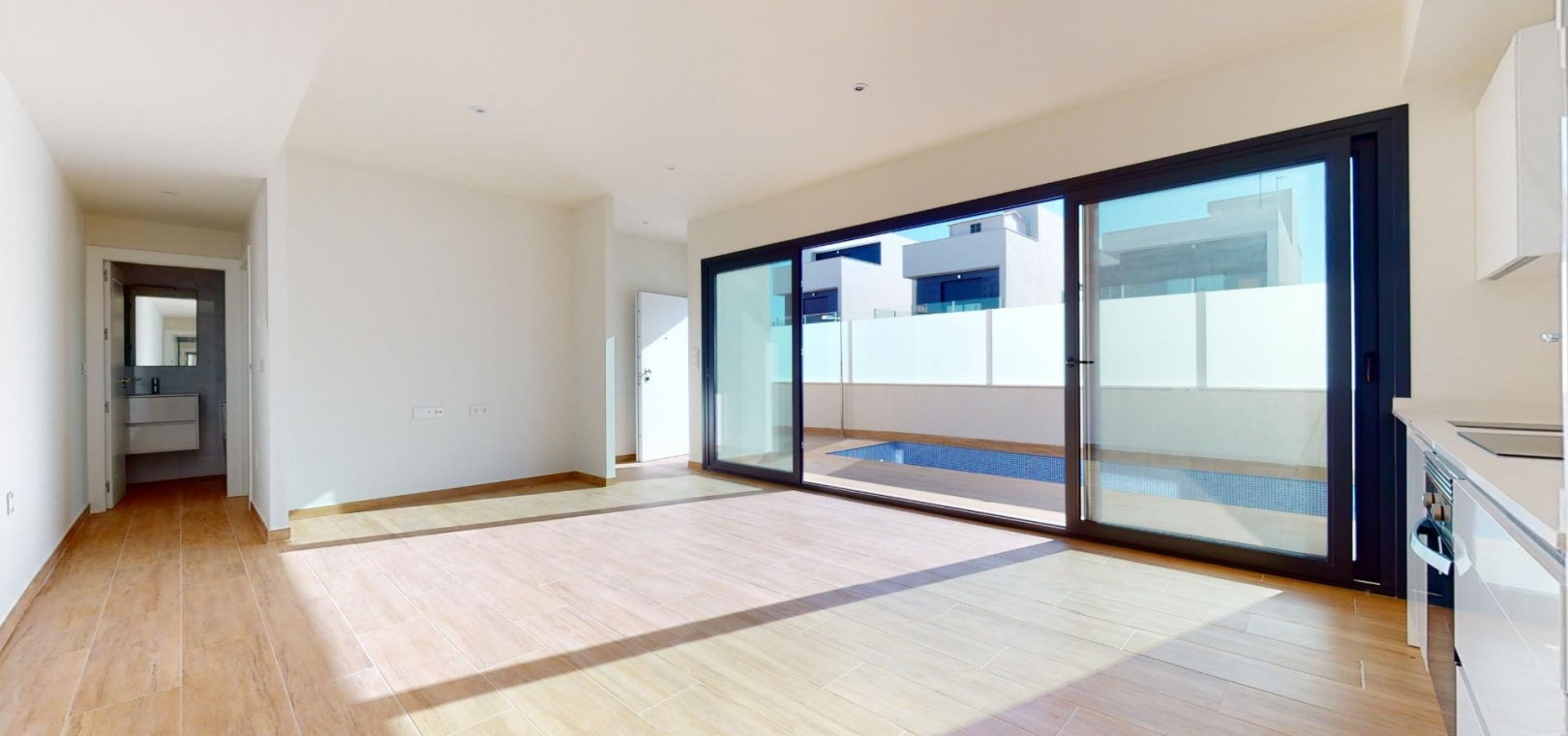 Nybyggd original quad erbjuder dig ett ljust vardagsrum/matsal med en spektakulär skjutdörr framför din privata pool, vilket ger vacker utsikt under dagen och avkopplande utsikt på natten.