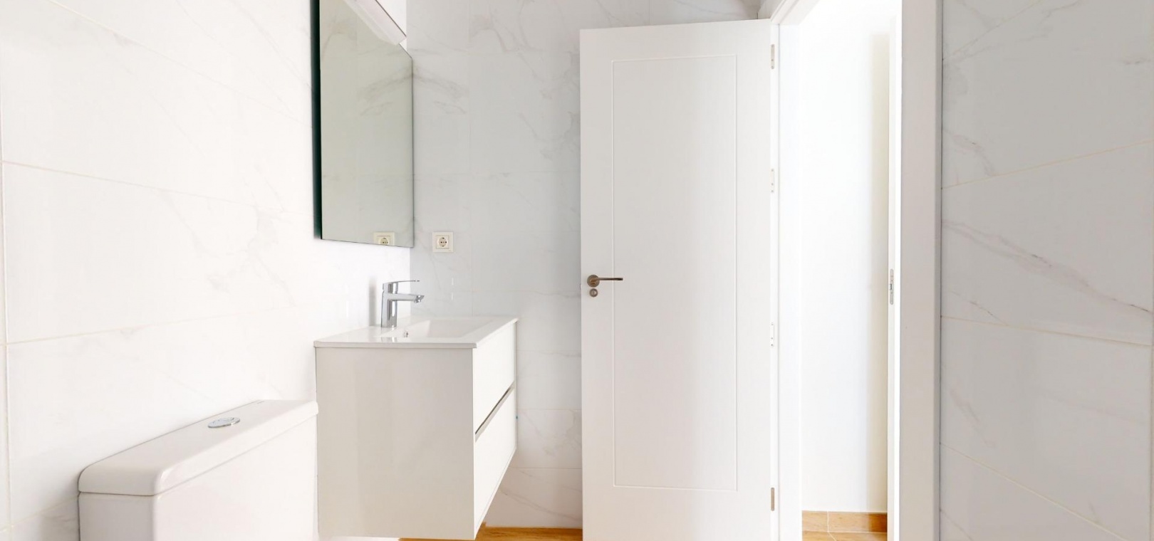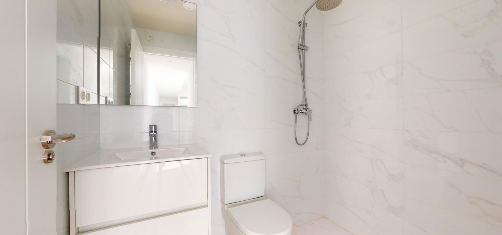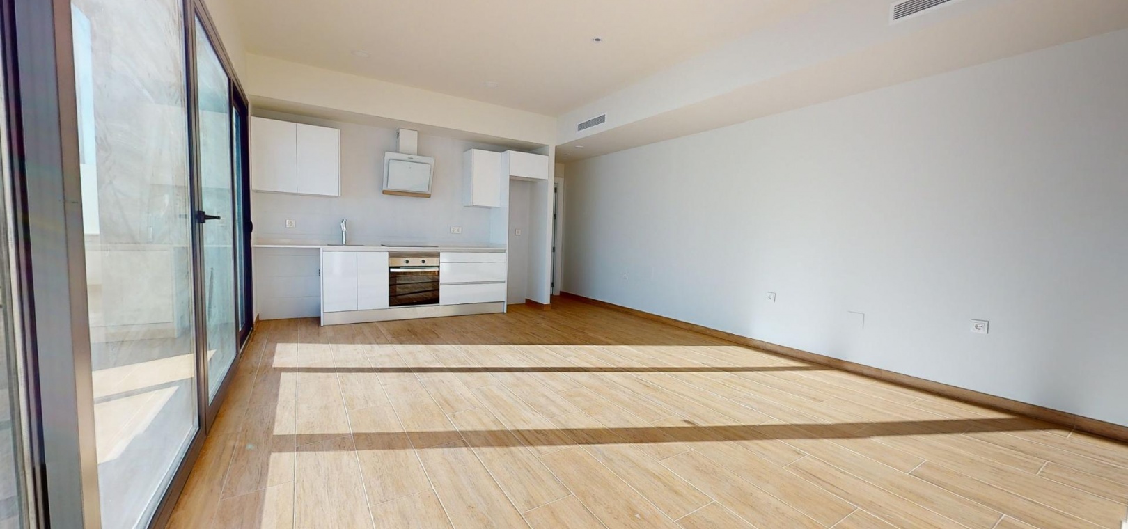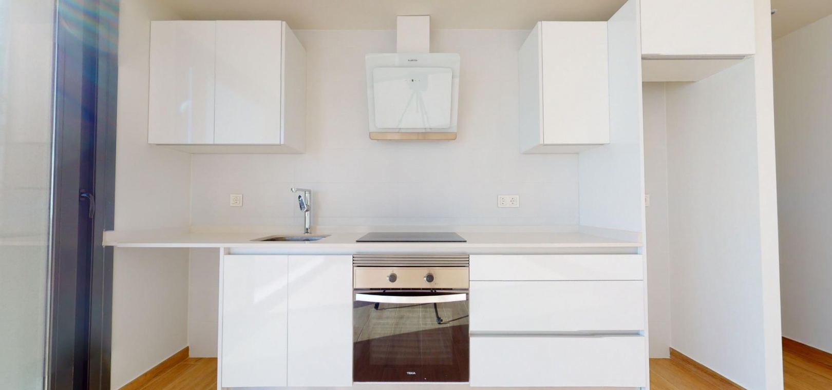 Du kommer också att ha ett modernt och funktionellt kök med bänkskiva av "Silestone"-typ, också vit. Här finns bland annat ugn, fläktkåpa och keramisk kokplatta.