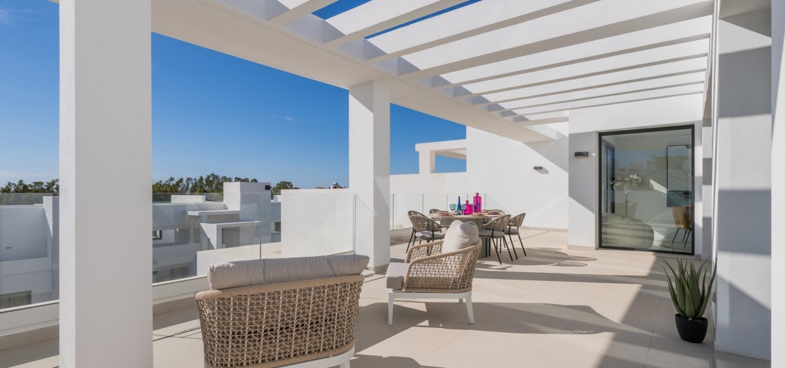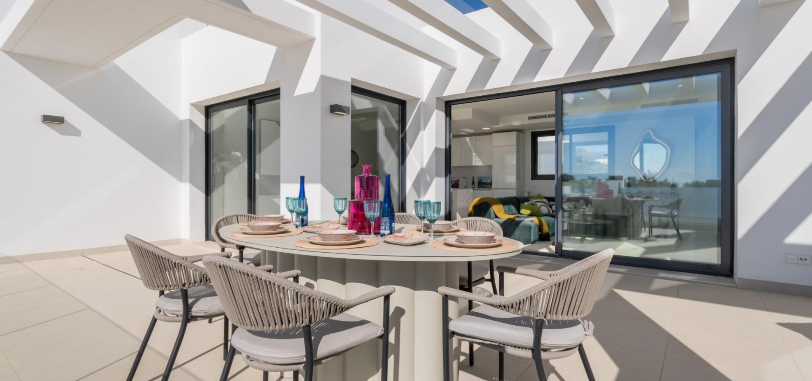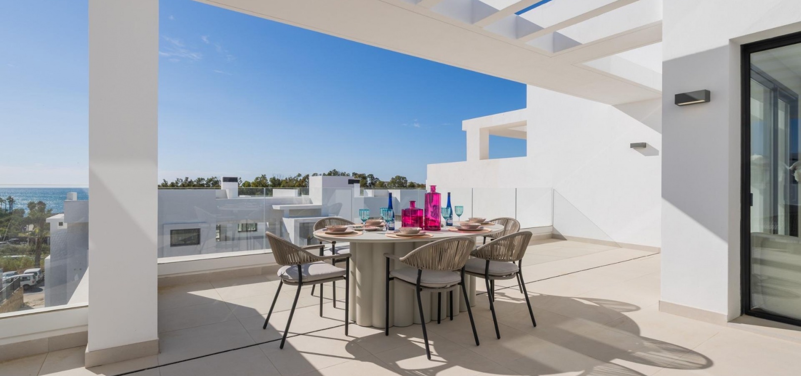 Husens imponerande terrass kommer att vara din bästa förtrogna för de tusentals speciella stunder som väntar dig här. Frukostar, middagar, solnedgångar? De flesta av bostäderna har vacker utsikt över Medelhavet, vi är säkra på att du kommer att njuta av ditt nya hem i detta bostadsområde till fullo!