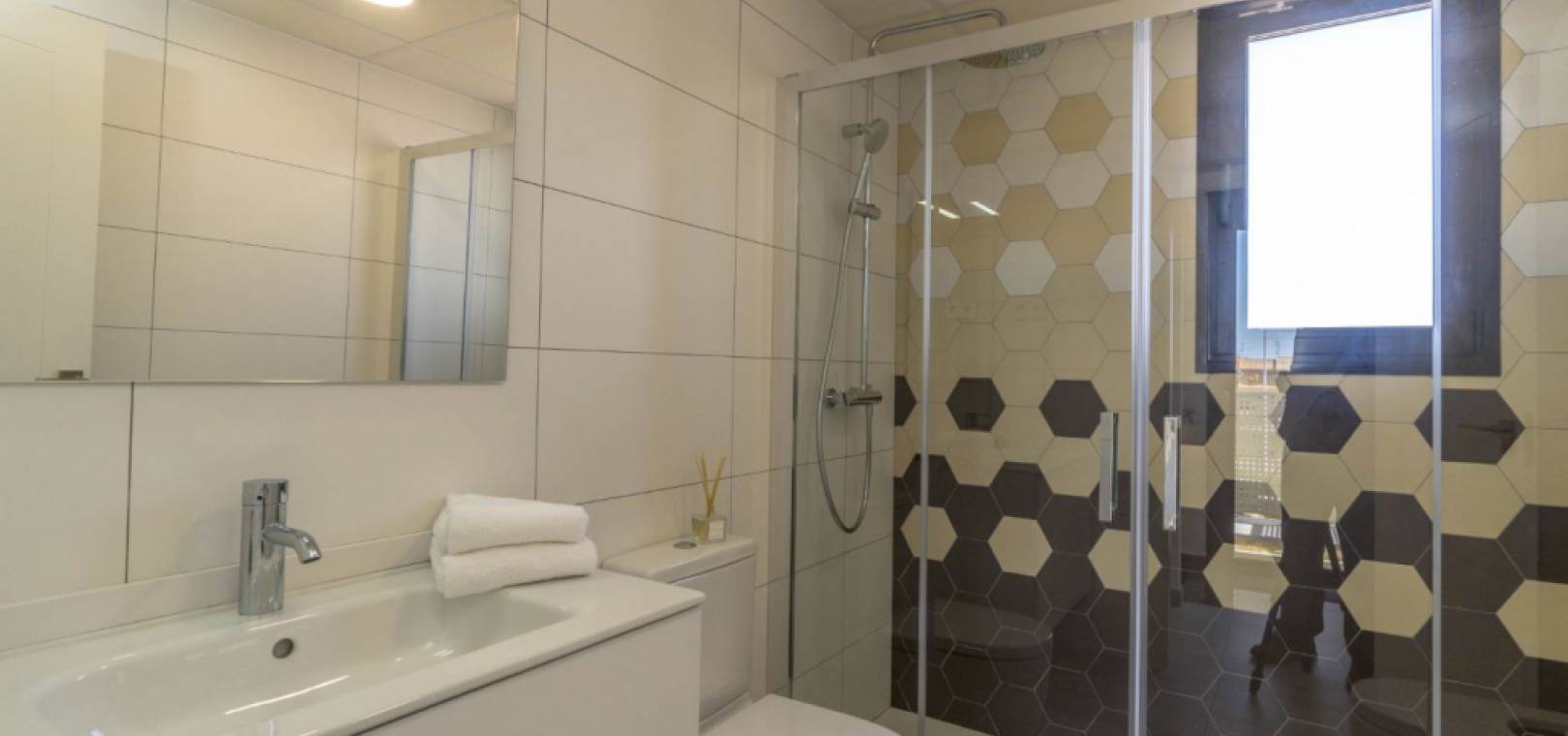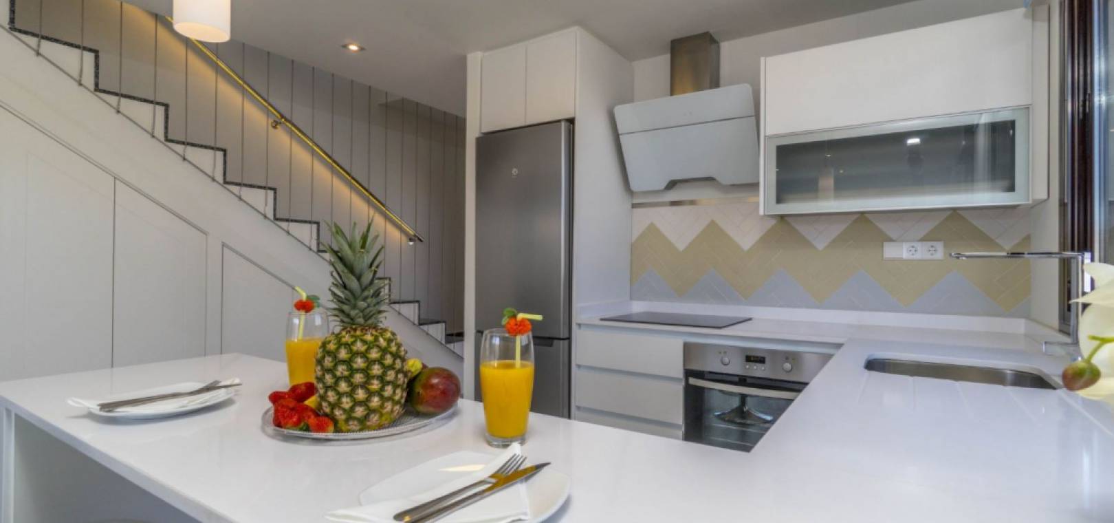 3 stora sovrum, 2 badrum, modern öppen planlösning med fullt utrustat kök i amerikansk stil. Det rymliga vardagsrummet har ett stort fönster som ger ett överflöd av ljus till nedre området. Solarium på taket är 53m2 och har fin tydlig utsikt. Det finns 90m2 trädgård med privat pool på 15m2. Det finns en uppfart för att parkera din bil på tomten.