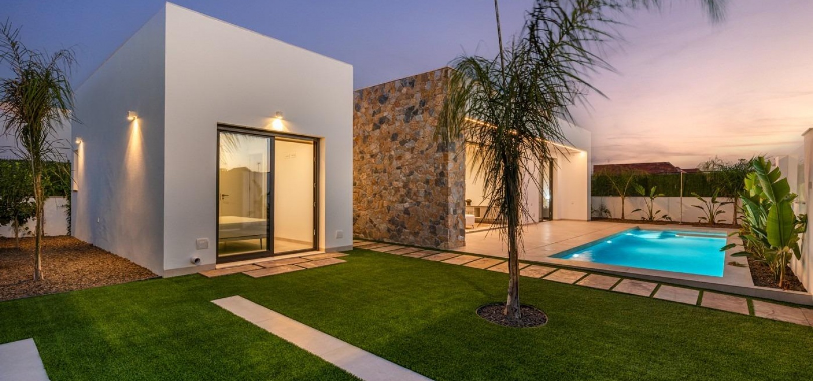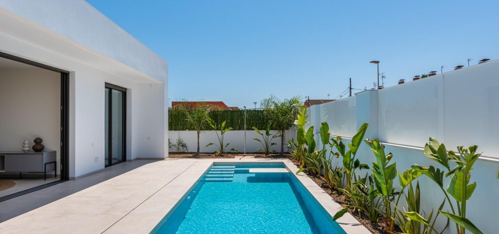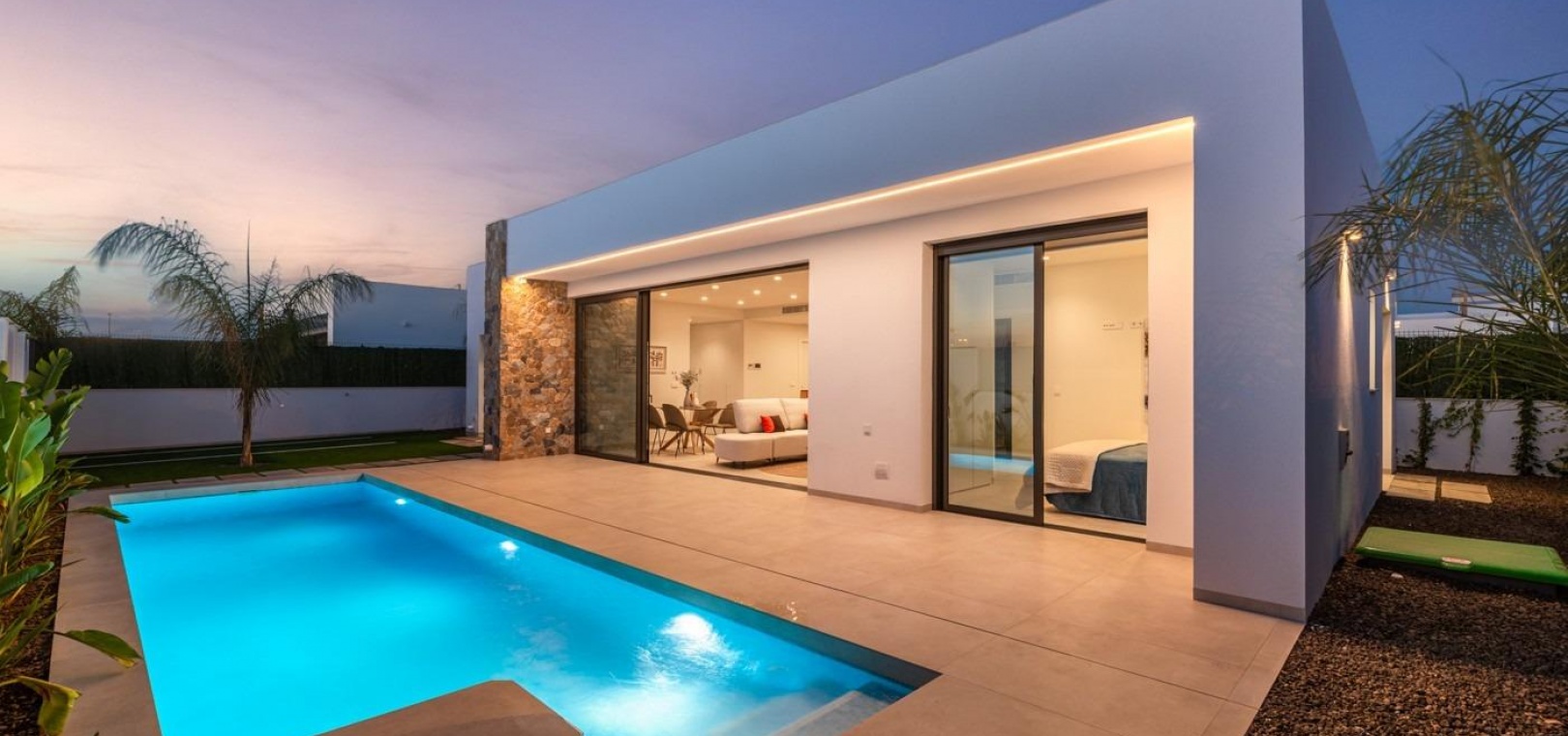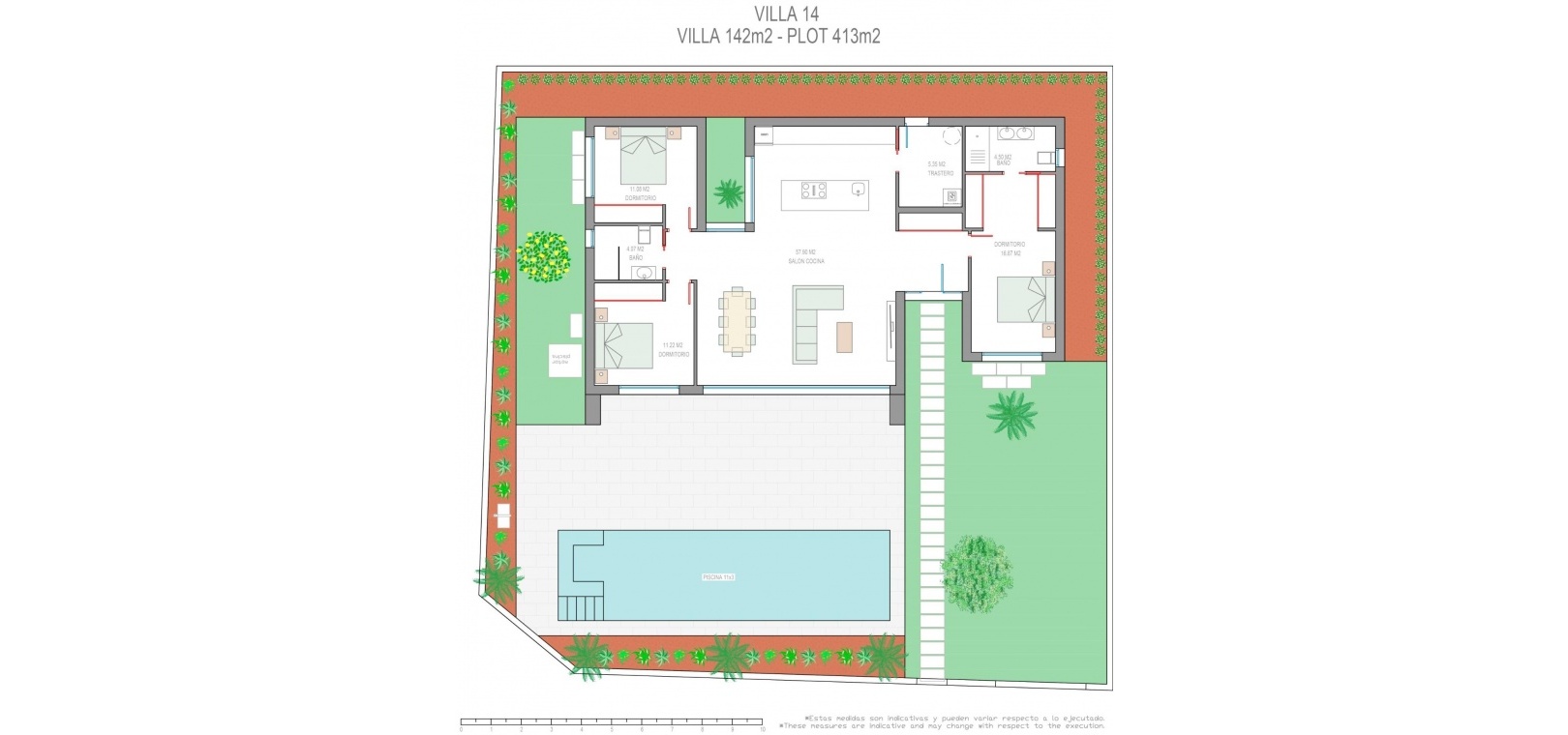 Villor byggs på 1 våning och består av 3 sovrum, 2 badrum, öppet kök, vardagsrum med öppen utsikt till terrassen, privat trädgård med pool.