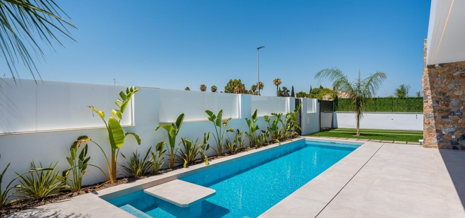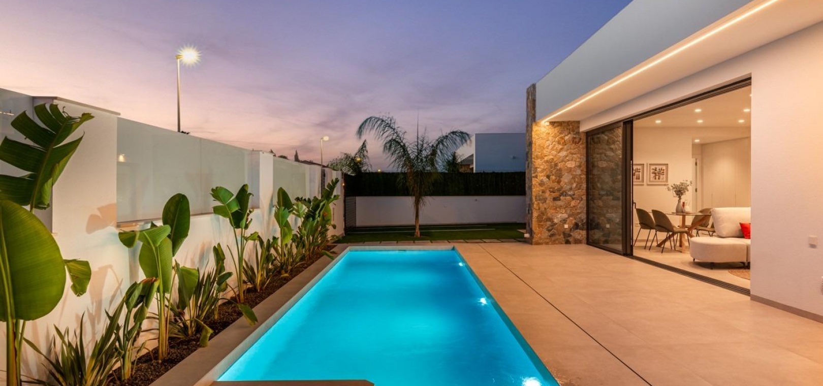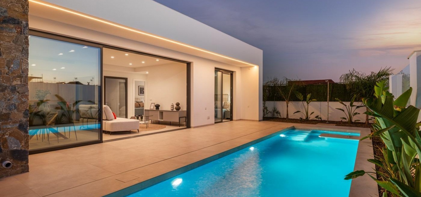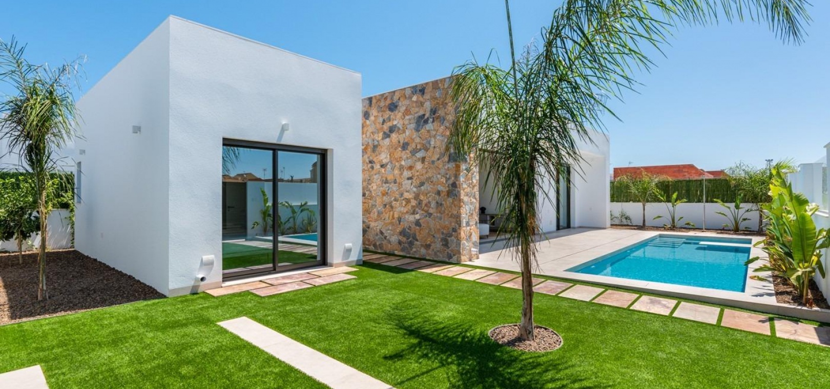 Villor byggs på 1 våning och består av 3 sovrum, 2 badrum, öppet kök, vardagsrum med öppen utsikt till terrassen, privat trädgård med pool.