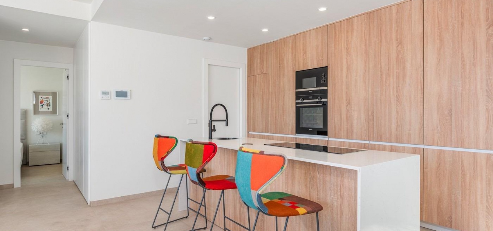 Fullt möblerat kök i vit glans eller träfärg inkluderar Induktionshäll med integrerad fläkt, ugn, mikrovågsugn, tvättmaskin, integrerad kylskåp och integrerad diskmaskin.