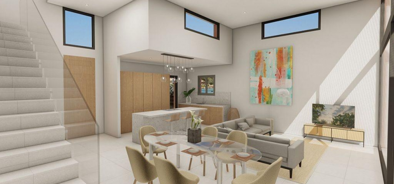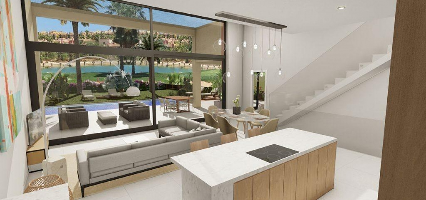 Bland funktionerna finns en intern reception som öppnar upp till ett omfattande vardagsrum / matsal och kök med öppen planlösning med "nivå genom" golv, på de täckta verandorna, privat anlagd trädgård och pool för att erbjuda ett kombinerat inre / yttre vardagsrum och matplats, utformad för att användas som en i regionens speciellt privilegierade klimat.
