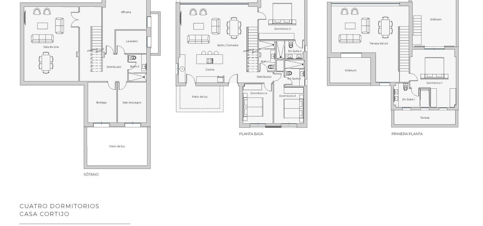 Det stora sovrummet med eget badrum ligger på första våningen och har direkt tillgång till den omfattande takloungen och terrassen. Det finns ytterligare två sovrum med eget badrum på bottenvåningen, ett med direkt tillgång till den omfattande verandan och poolen samt ett fjärde sovrum med separat badrum.